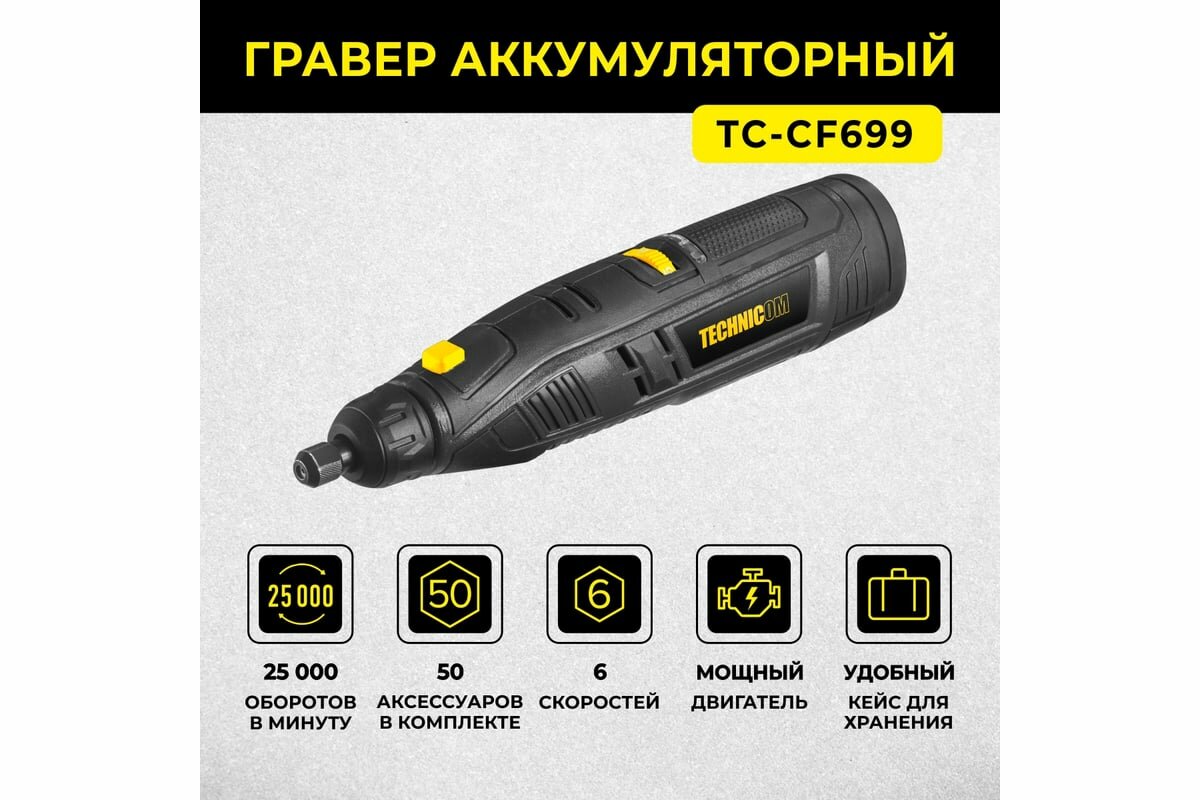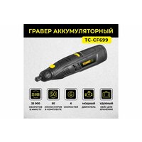 TC-CF699 – многофункциональный аккумуляторный гравер, с удобной прорезиненной рукояткой, регулировкой скоростей и большим набором аксессуаров, позволяющих выполнять множество операций, связанных с механической обработкой твёрдых материалов. Данная модель имеет небольшой вес, ёмкий аккумулятор и высокую производительность.