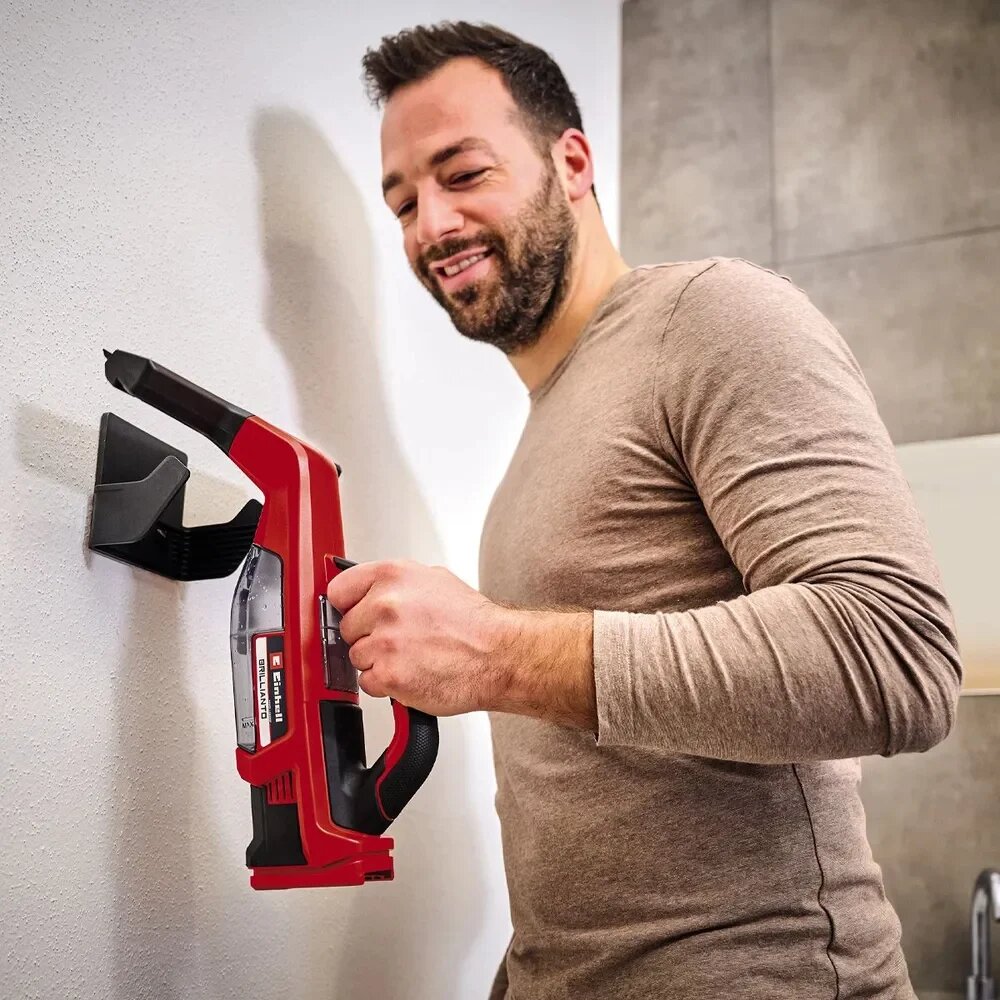 Аккумуляторный мойщик окон Einhell PXC BRILLIANTO хранится в настенном кронштейне, входящем в комплект поставки. Это позволяет сэкономить место и удобно разместить устройство на стене.