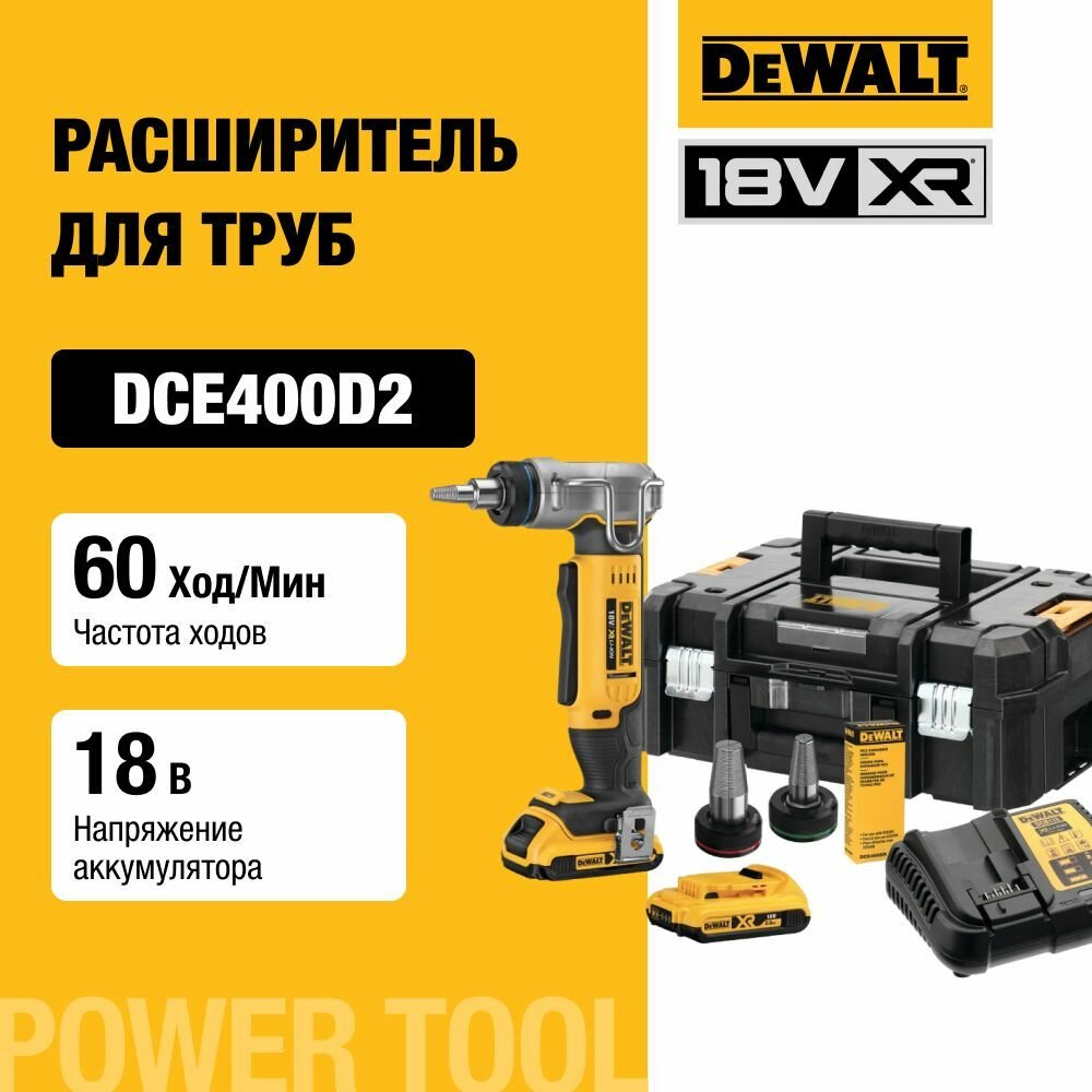 Купить Аккумуляторный расширитель для труб DEWALT DCE400D2, 18 В, 60 ход/мин, до 25 мм, с 2 АКБ 2 Ач и ЗУ, в кейсе TSTAK с доставкой по всей России. Аккумуляторный расширитель для труб DEWALT DCE400D2, 18 В, 60 ход/мин, до 25 мм, с 2 АКБ 2 Ач и ЗУ, в кейсе TSTAK: сравнение цен, характеристики, фото, актуальное наличие и цены.