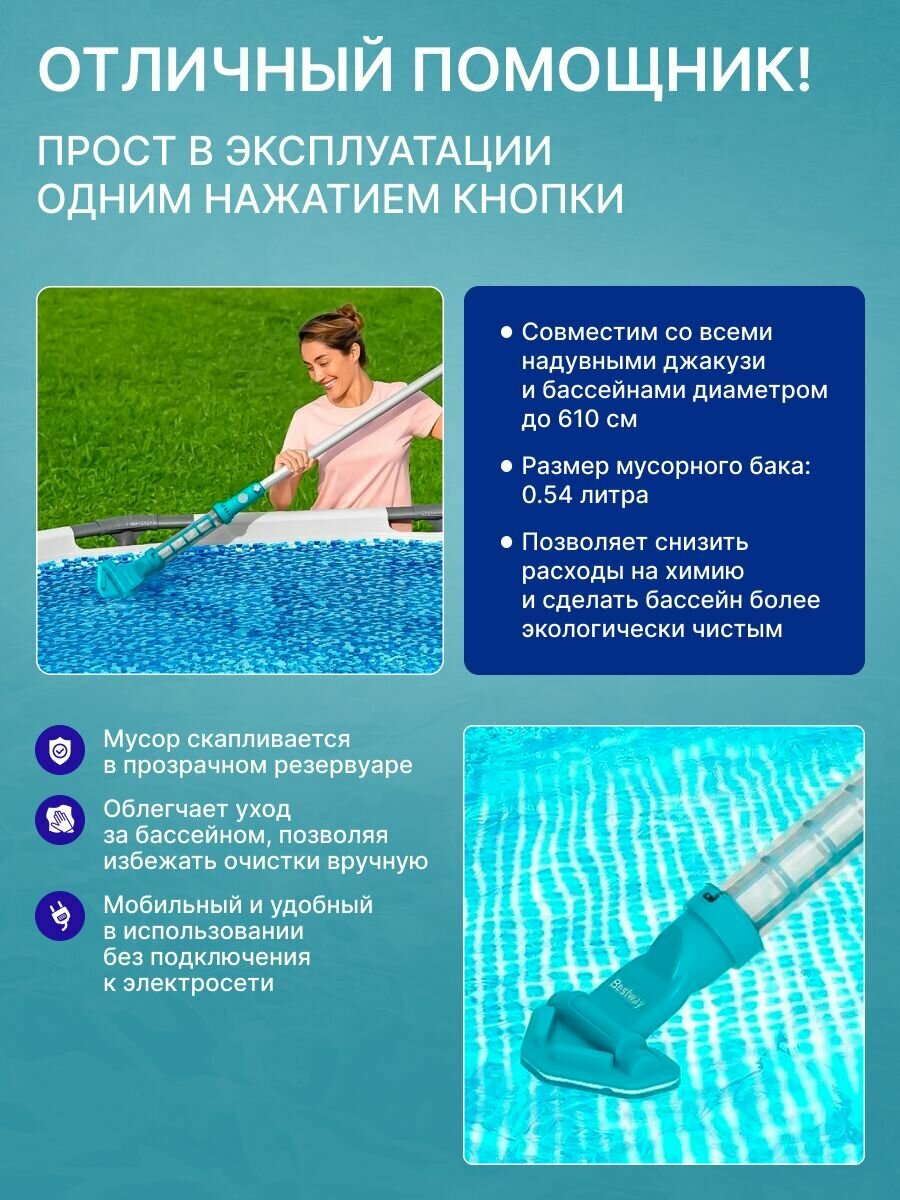 Пылесос для бассейнов Bestway 58771 – удобный и эффективный инструмент для очистки дна и стенок вашего бассейна. Он поможет поддерживать кристальную чистоту воды, избавляя от песка, грязи и другого мусора.