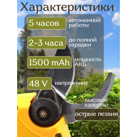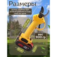 Аккумуляторные секаторные ножницы для резки и обрезки ветвей и сучьев. Для сада и огорода. Лезвие, изготовлено из вольфрамовой стали, долговечное. Аккумулятор: 48V 1500 мАч 2 шт Напряжение зарядки: 110-220 В Время зарядки: 1-1,5 h Время работы: 4-5 ч Мощность: 500 Вт Для включения однократно нажать кнопку (не держать долго), после 2 раза быстро нажать курок. В 8-10 раз эффективнее традиционного ручного секатора. Качество обрезки значительно выше по сравнению с ручным секатором. Комплектация: Электрический корпус ножниц Адаптер питания Аккумулятор 2 шт Шестигранный ключ Рукав Руководство пользователя Чемодан