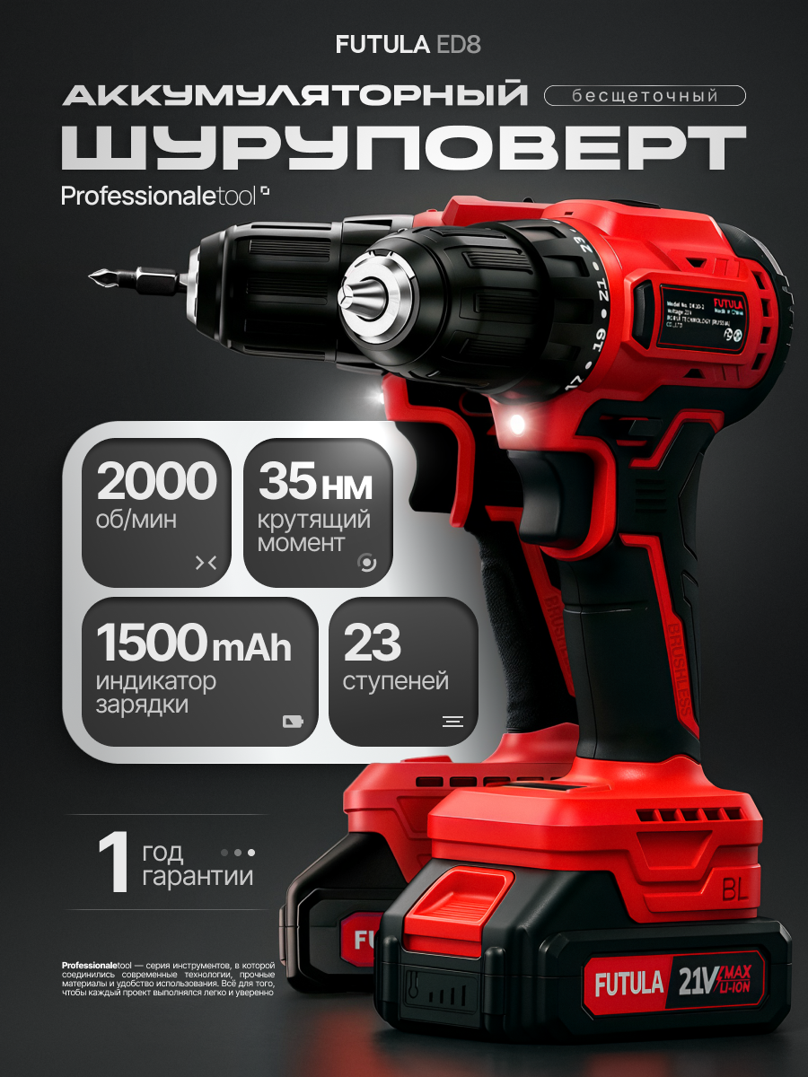 Аккумуляторный Шуруповёрт Futula ED8 красный, крутящий момент до 35 Нм, диаметр оснастки от 0,8 до 13 мм, LED-подсветка: сравнение цен, характеристики, фото, актуальное наличие и цены.