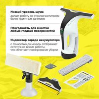 | Дополнительная информация | Энергии аккумулятора хватает на 100 минут работы, что позволяет производить уборку без перерывов на его зарядку. Эргономичная конструкция Компактный и легкий аппарат с удобной ручкой обеспечивает максимальный комфорт. Съемная стяжка После уборки стяжку можно легко снять со всасывающей насадки для очистки. Быстрое и гигиеничное опорожнение бачка Гигиеничное снятие и опорожнение бака для грязной воды без контакта с грязью. В 3 раза быстрее Аккумуляторный стеклоочиститель втрое ускоряет мойку окон в сравнении с обычными методами выполнения этой работы. Очистка без разводов и капель воды Электрическое всасывающее устройство исключает загрязнение окружающего пространства стекающими каплями грязной воды и обеспечивает сияющую чистоту стекол. Широкий спектр решаемых задач Пригодность для очистки любых гладких поверхностей, например керамической плитки, зеркал или стенок душевых кабин. |