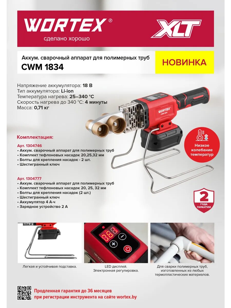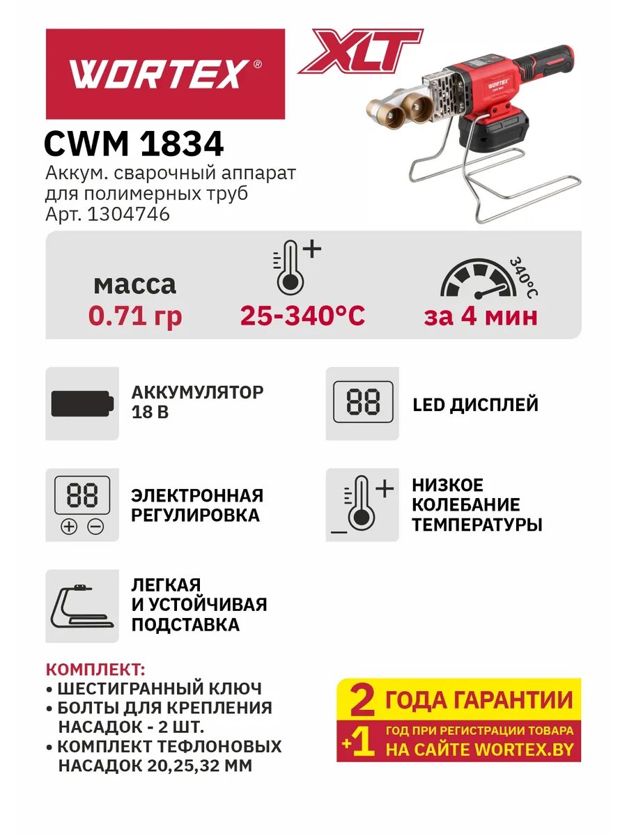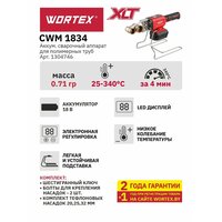 Аккумуляторный сварочный аппарат WORTEX CWM 1834 ALL1 XLT SOLO — это незаменимый инструмент для сварки полимерных труб, изготовленных из любых термопластических материалов.
