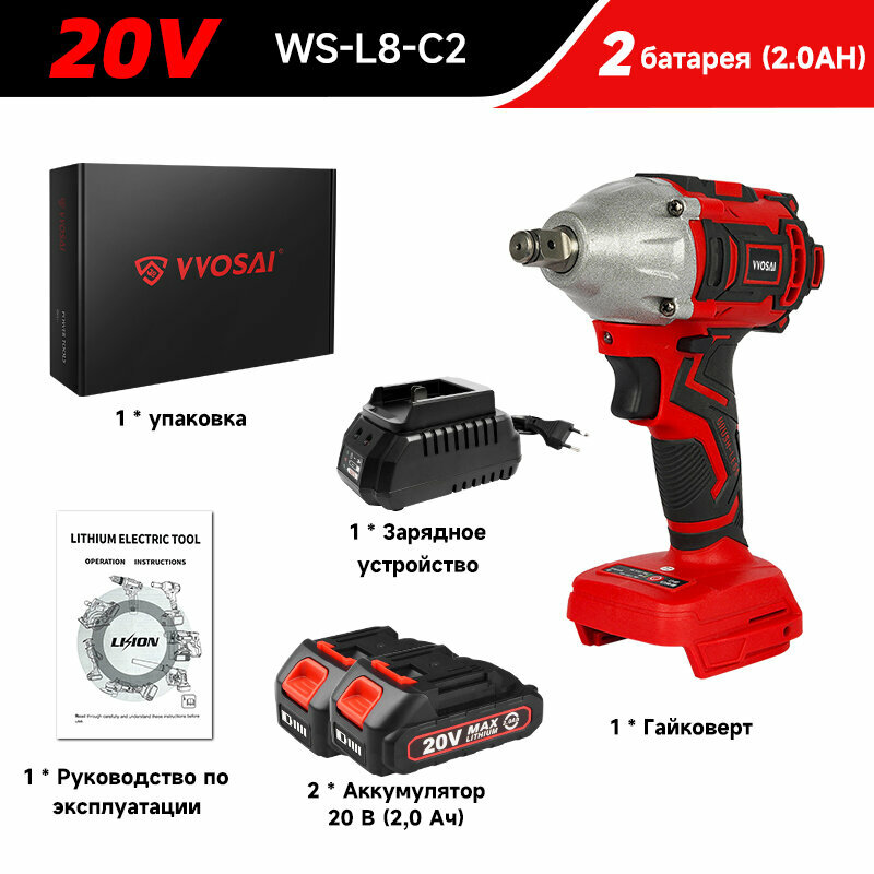 Аккумуляторный ударный гайковерт Бесщеточный VVOSAI WS-L8-C2 20 В 320 Нм 2 литий-ионных аккумулятора 2,0 Ач: сравнение цен, характеристики, фото, актуальное наличие и цены.