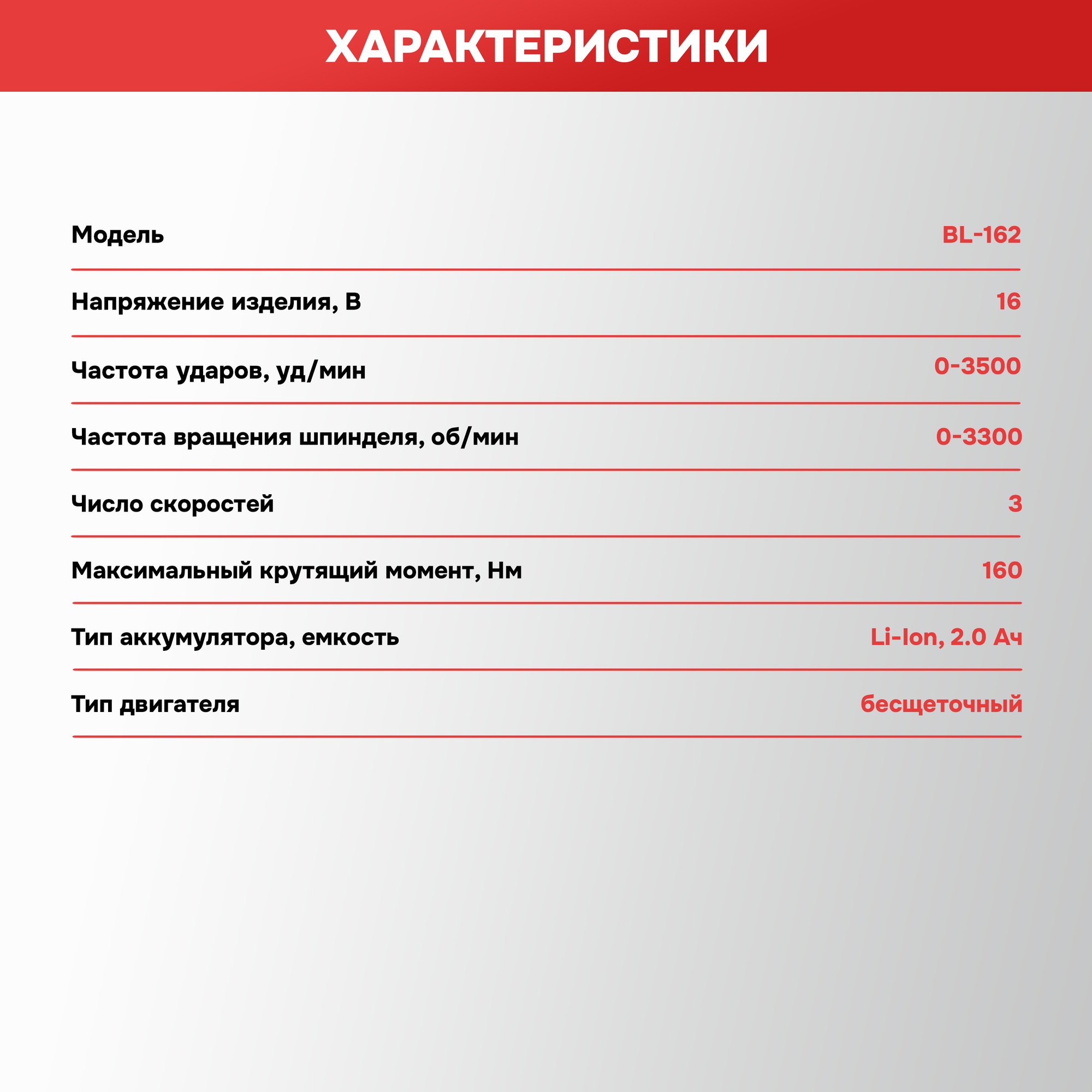 Купить Аккумуляторный бесщеточный винтоверт PROFIPOWER BL-162(16В,160Нм, Li-ion 2шт,2.0Ач,3 скорости, З/У, в кейсе) с доставкой по всей России. Аккумуляторный бесщеточный винтоверт PROFIPOWER BL-162(16В,160Нм, Li-ion 2шт,2.0Ач,3 скорости, З/У, в кейсе): сравнение цен, характеристики, фото, актуальное наличие и цены.