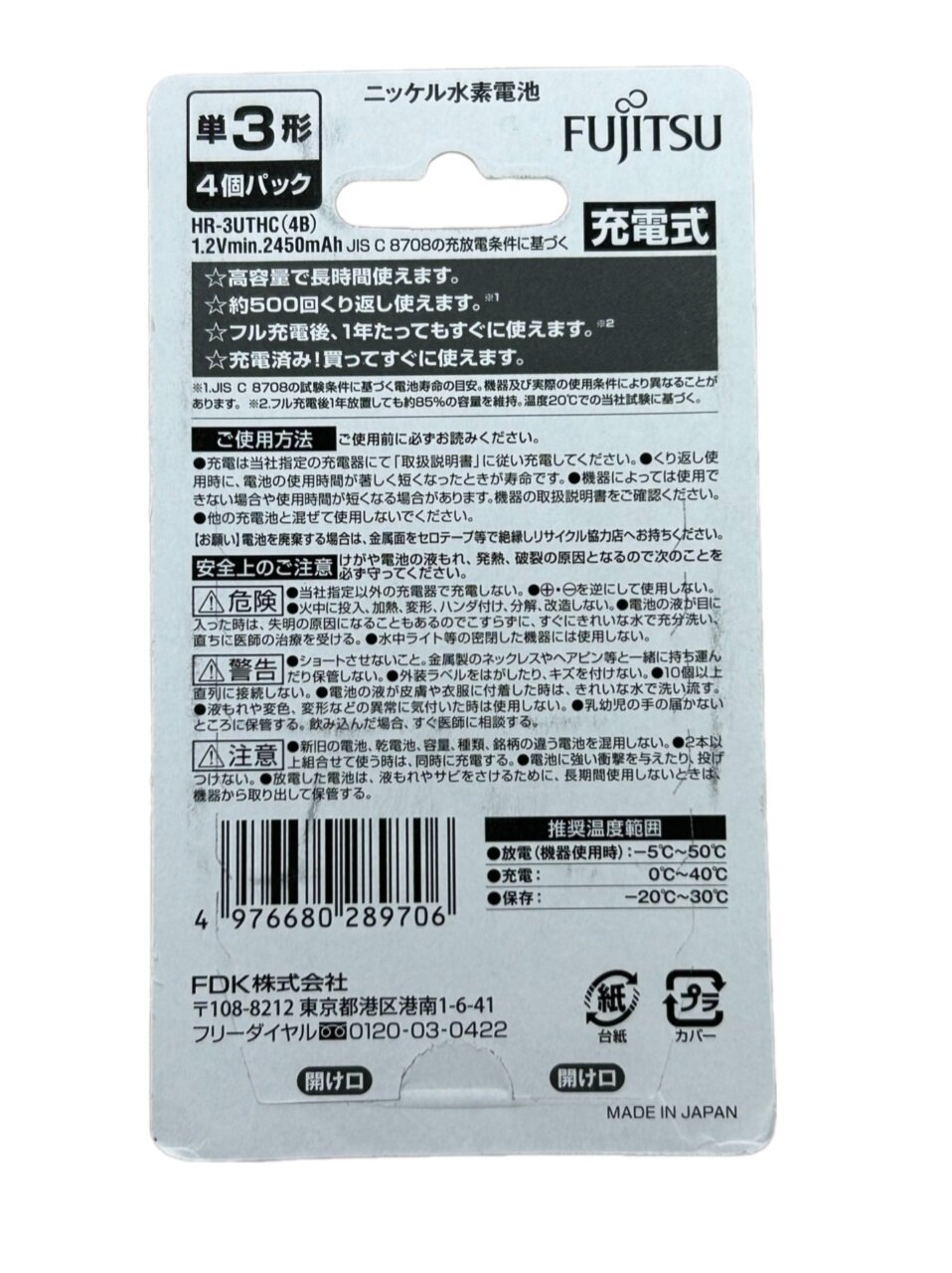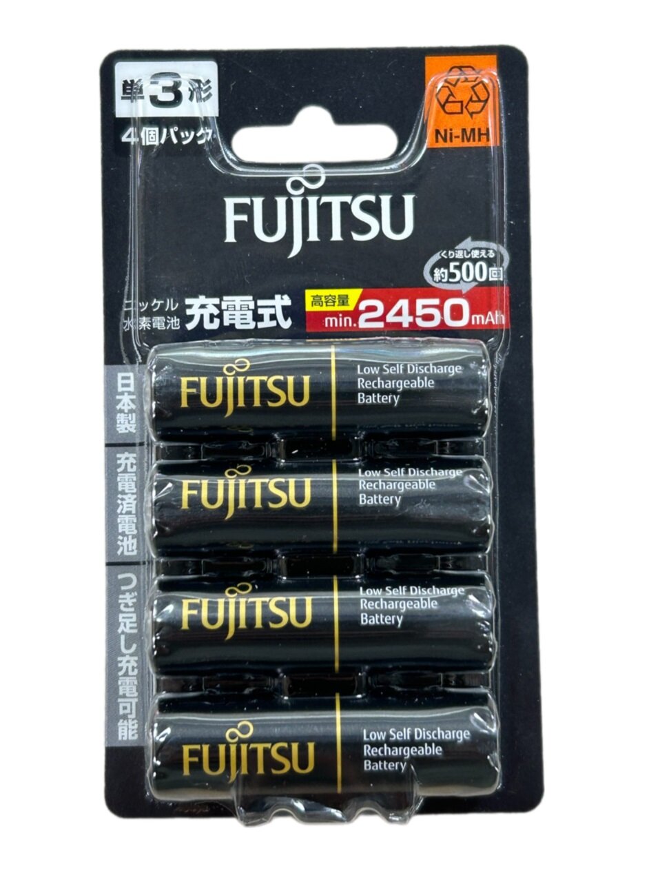 Родные японские аккумуляторы выпущенные FUJITSU для внутреннего рынка. Упаковка 4шт (АА) в блистере. Полный аналог чёрных Eneloop PRO. Код производителя HR-3UTC(4B). Гарантированная ёмкость от 2450mAh.