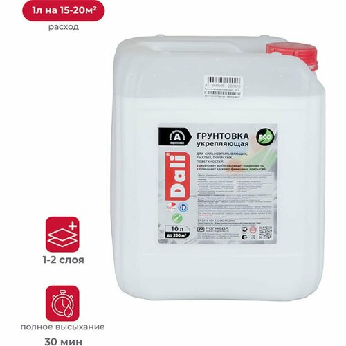 Акриловая укрепляющая грунтовка DALI 10л 1 15699 подготавливает пористые, рыхлые и сильно впитывающие минеральные поверхности (кирпич, гипс, бетон, штукатурка, дерево) к последующему нанесению отделочных материалов. Продукт используют во время наружных и внутренних работ для повышения адгезионных и сцепляющих свойств обработанных покрытий. Состав на водно-дисперсионной основе уменьшает расход финишных красок.