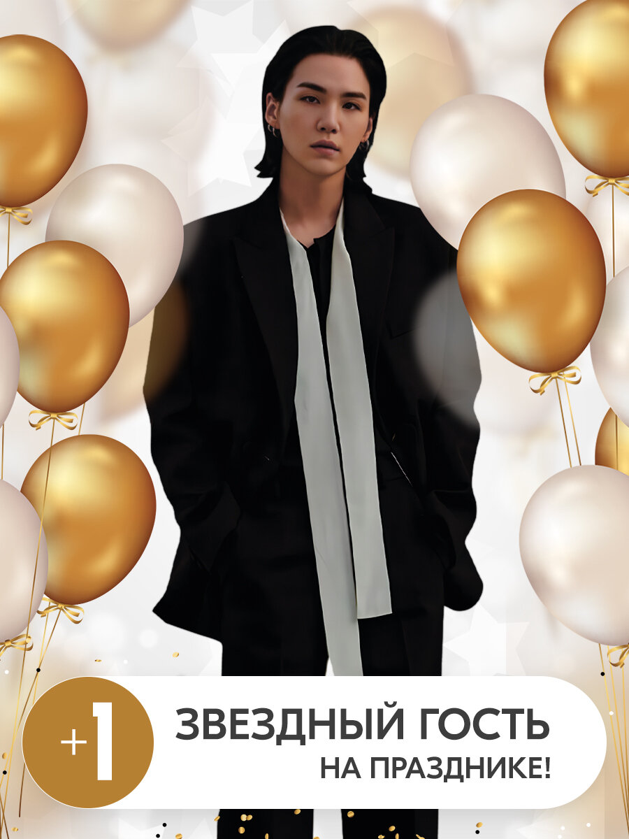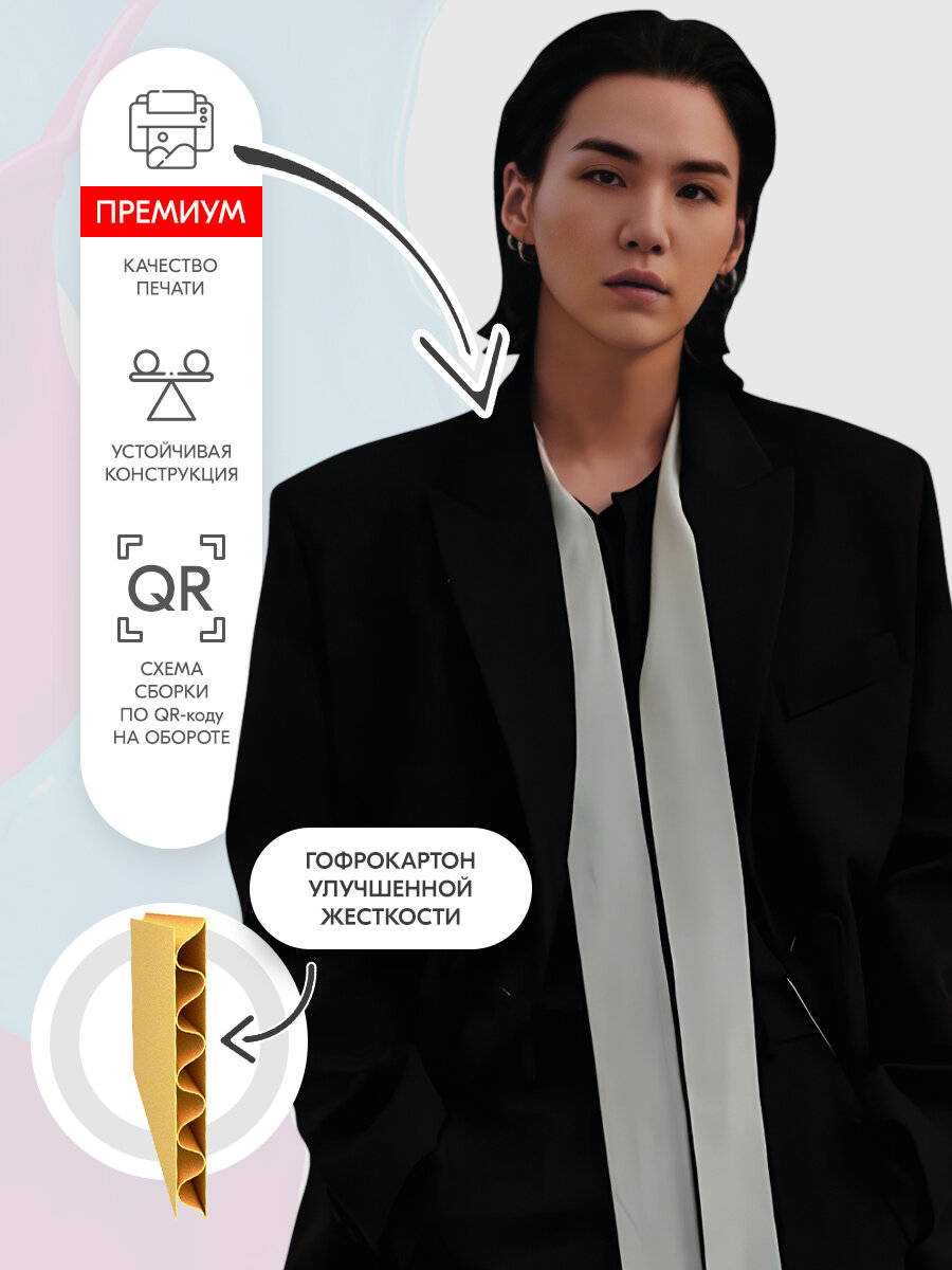 Картонная ростовая фигура Мин Юнги (BTS). Мин Юнги, более известный как Сюга. Оригинальный подарок коллеге, другу, подруге, парню или девушке для проведения фотоссесии, создания веселой атмосферы праздника, такого как День рождения или Новый год, создания атмосферы веселого настроения. Также кукла баннер отлично подойдет для розыгрыша, пранка или украшения интерьера в качестве необычного и креативного аксессуара или даже игрушки. Изготовлен из премиального, беленого, трехслойного гофрокартона толщиной 3 мм с напечатанным, экологически чистым способом, ультрафиолетовой цифровой печатью, высококачественным изображением. Имеет сзади приклеенную, раскладную ногу, которая позволяет фигуре вертикально стоять. Доставляется сложенным пополам в картонной коробке.