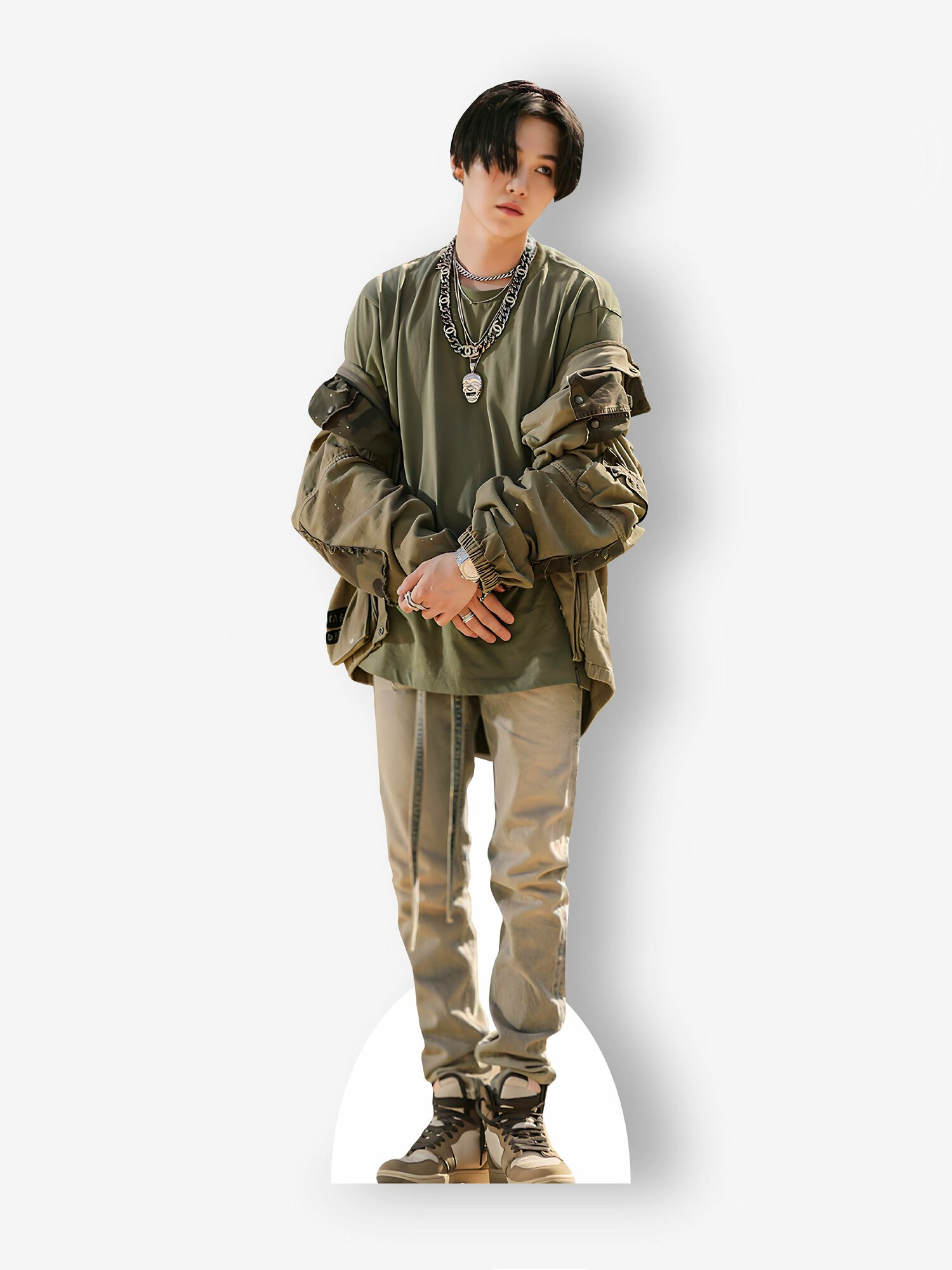 Картонная ростовая фигура Мин Юнги (BTS). Оригинальный подарок коллеге, другу, подруге, парню или девушке для проведения фотоссесии, создания веселой атмосферы праздника, такого как День рождения или Новый год, создания атмосферы веселого настроения. Также кукла баннер отлично подойдет для розыгрыша, пранка или украшения интерьера в качестве необычного и креативного аксессуара или даже игрушки. Изготовлен из премиального, беленого, трехслойного гофрокартона толщиной 3 мм с напечатанным, экологически чистым способом, ультрафиолетовой цифровой печатью, высококачественным изображением. Имеет сзади приклеенную, раскладную ногу, которая позволяет фигуре вертикально стоять. Доставляется сложенным пополам в картонной коробке.