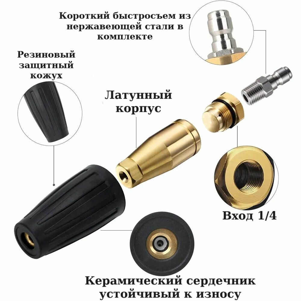 Вращающаяся на 360 градусов турбонасадка распылитель с 1/4 внутренней резьбой для мойки высокого давления. Это высококачественный поворотный турбораспылитель с внутренней резьбой, так же в комплекте идет быстросъем 1/4 дюйма.