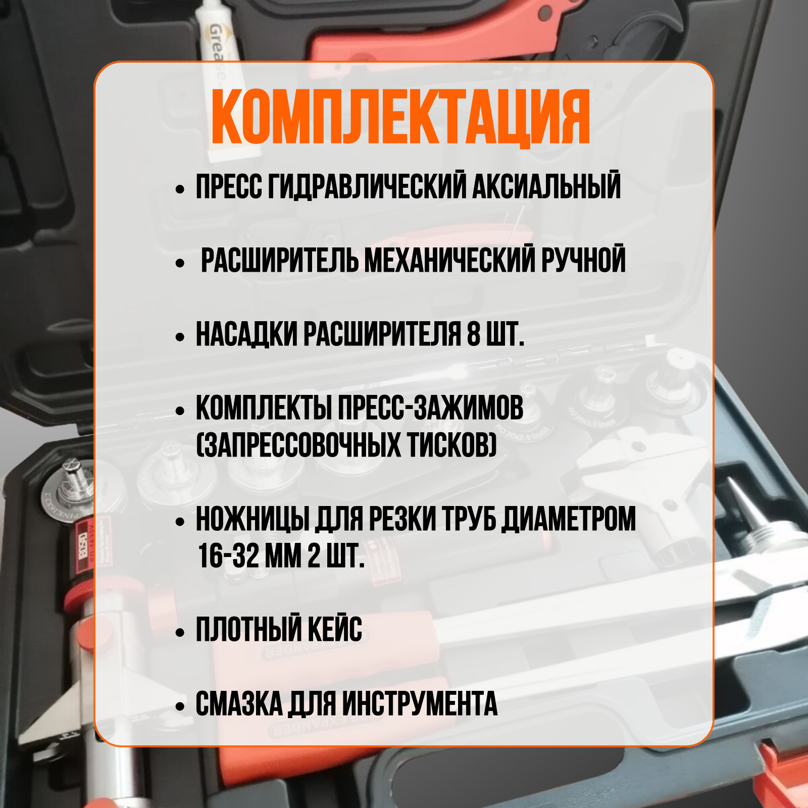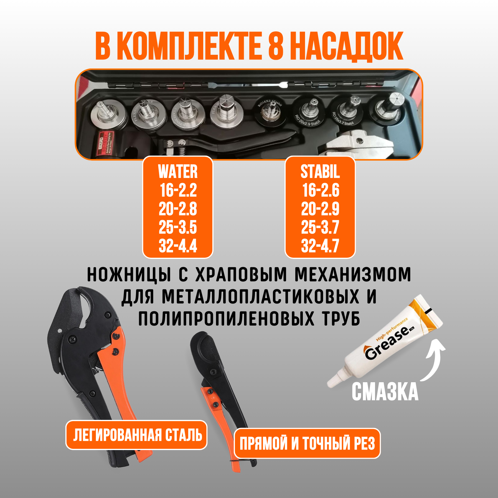 Зажимные инструменты для монтажа систем из металлопластика, нержавейки и медных. Гидравлический инструмент подходит для труб из сшитого полиэтилена и полиэтилена повышенной термостойкости диаметром до 32 мм.