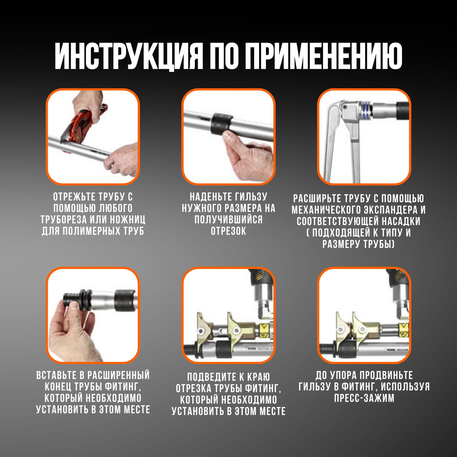 Аксиальный пресс-инструмент прост в использовании, Вам достаточно отрезать трубу необходимого размера, надеть на трубу надвижную гильзу, расширить трубу с помощью экспандера, вставить фитинг и сделать аксиальную запрессовку.