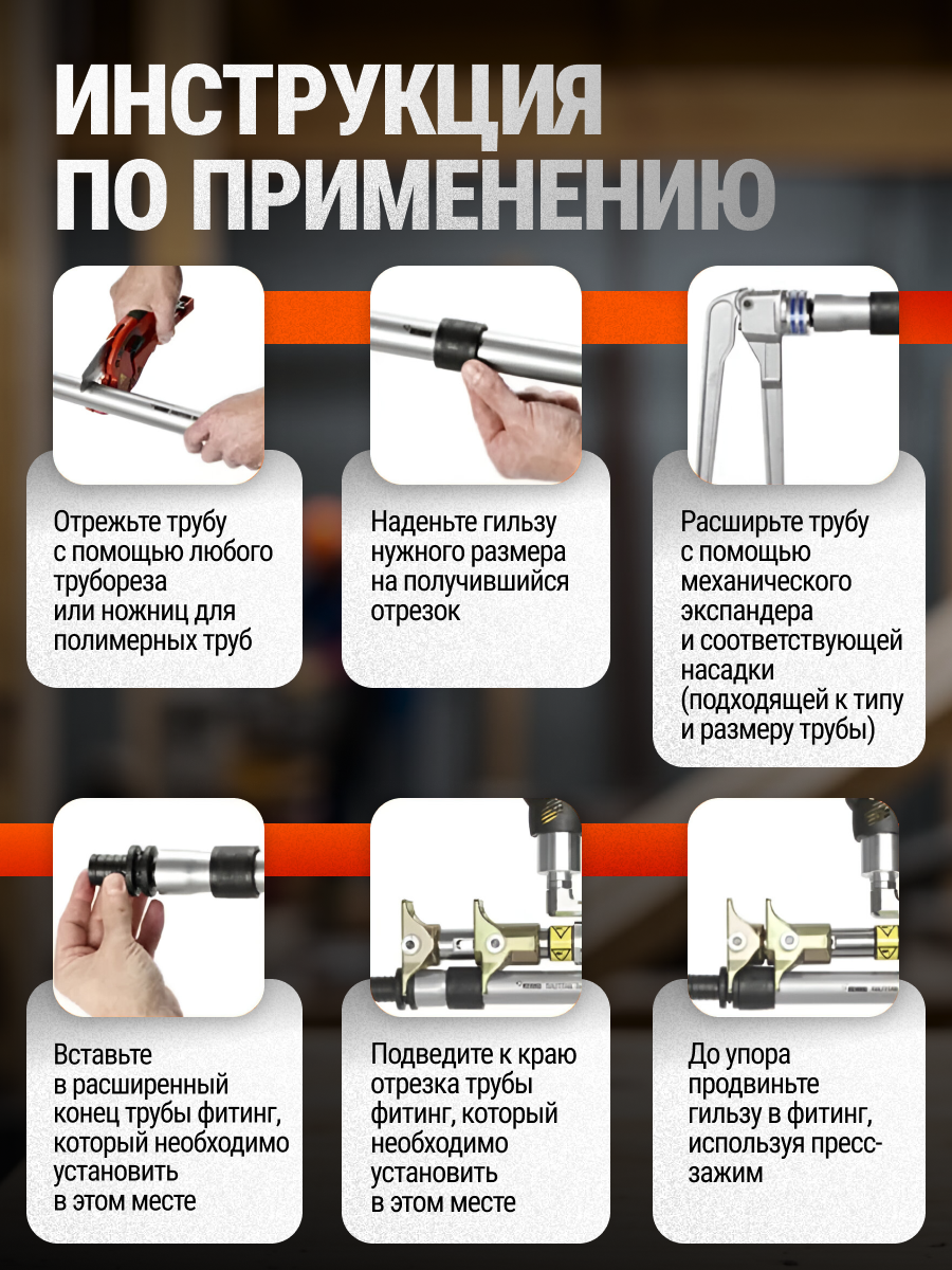 Аксиальный пресс-инструмент прост в использовании, Вам достаточно отрезать трубу необходимого размера, надеть на трубу надвижную гильзу, расширить трубу с помощью экспандера, вставить фитинг и сделать аксиальную запрессовку.