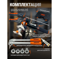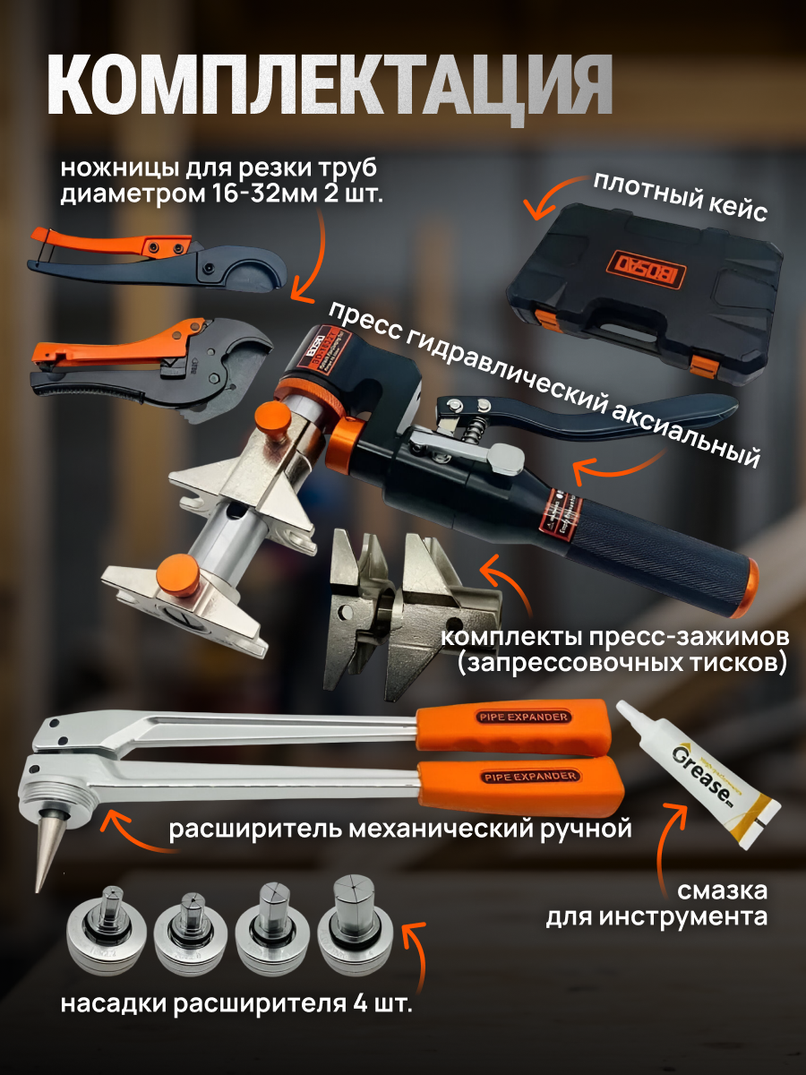 Зажимные инструменты для монтажа систем из металлопластика, нержавейки и медных. Гидравлический инструмент подходит для труб из сшитого полиэтилена и полиэтилена повышенной термостойкости диаметром до 32 мм.