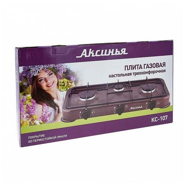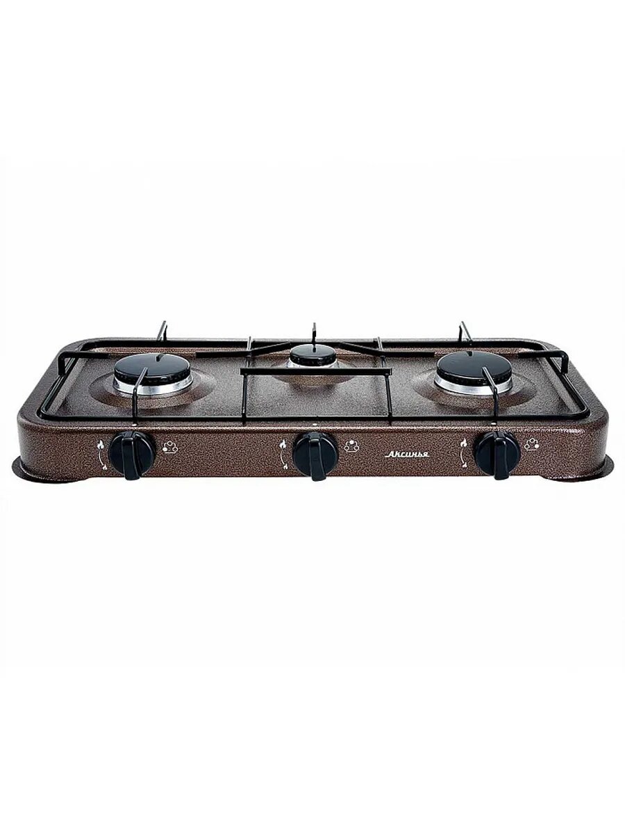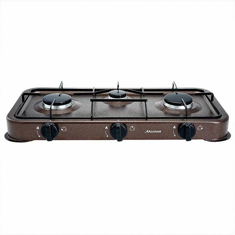 Газовая плита настольная 3-конфорочная аксинья КС-107 коричневая. Предназначена для приготовления и разогрева пищи в бытовых условиях, только с бытовыми газовыми баллонами.