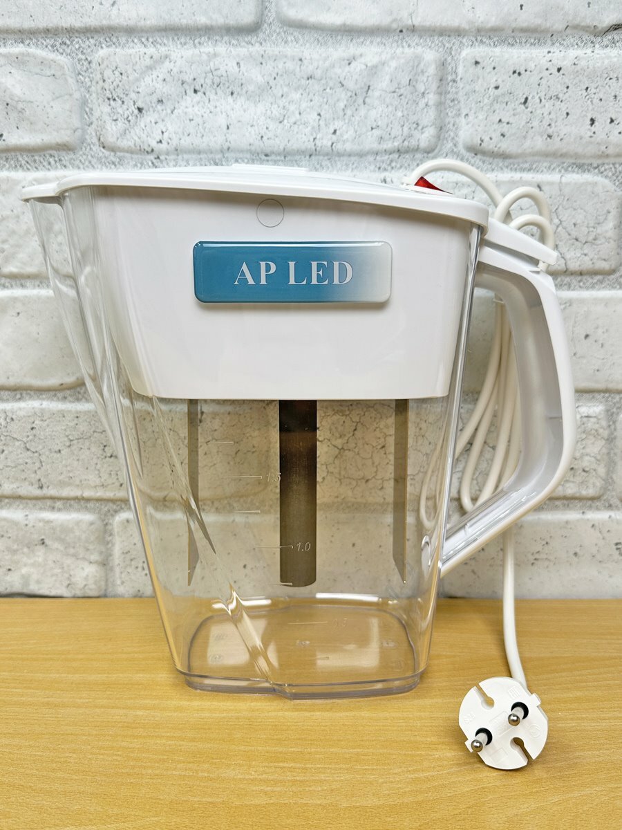 Прибор состоит из корпуса и съемной крышки. Вся электронная начинка и кнопка «ВКЛ/ВЫКЛ» находятся в крышке, снизу расположены три электрода. Общий объем кувшина - 2 л. В качестве разделителя используется стакан 250 или 500 мл, в зависимости от того, сколько и какой воды вам нужно. Приготовление щелочной и кислотной воды происходит одновременно - светлые электроды в кувшине, темный в стакане.
