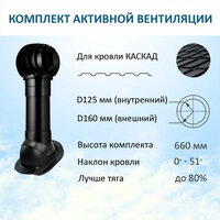 Комплект активной вентиляции: Турбодефлектор TD160, вент. выход утепленный высотой Н-500, проходной элемент для металлочерепицы «Каскад», черный - служит для увеличения тяги в вентиляционном канале частного или многоквартирного дома, в погребе, гараже, курятнике, коровнике, конюшне, предбаннике, в парилке бани, внешней вентиляции септика и складских помещениях.