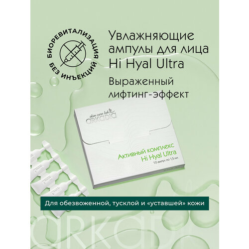 Активный комплекс ARKADIA Hi Hyal Ultra предназначен для биоревитализации кожи без инъекций. В комплект входят 10 ампул, каждая из которых содержит интенсивный состав для увлажнения и ревитализации обезвоженной кожи.