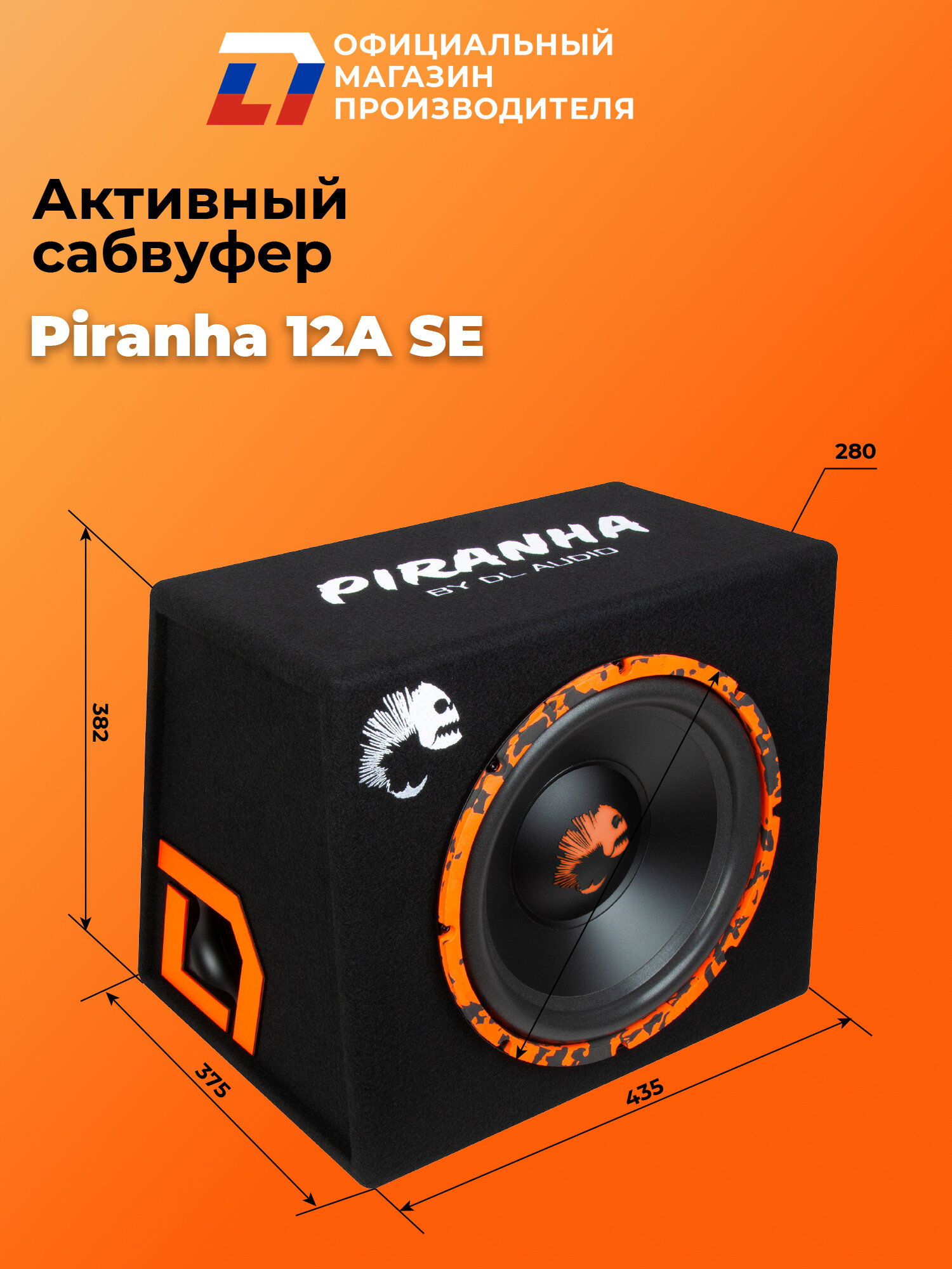 Официальная гарантия 2 года, а так же доступ к программе подменного фонда. Piranha 12A SE Доступное и надежное готовое сабвуферное звено с уникальным внешним видом. Надежная сабвуферная головка и встроенный усилитель. Уникальная фирменная конструкция ФИ-порта. Автоматическая подсветка логотипа при включении. Все необходимые для установки кабели и аксессуары в комплекте. - Номинальный диаметр:300 мм Пиковая мощность:600 Вт Частотный диапазон:25-200 Гц Тип: Компактный Размеры:435 x 358 x 375 мм - С этим так же покупают Динамики автомобильные компонентные DL Audio Python 165 Comp Динамики автомобильные коаксиальные DL Audio Python 165 Coax Динамики автомобильные 16см DL Audio Barracuda 165 V.2 Колонки в машину/Колонки автомобильные/Колонки/Динамики/Динамики в машину/Динамики автомобильные/Автозвук/Автоакустика/Широкополосные/Эстрадные/Штатные/Усилитель/усилитель звука/усилитель автомобильный/усилитель для динамиков/усилитель для сабвуфера/усилитель в авто/Сабвуфер/Сабвуфер автомобильный/Магнитола/