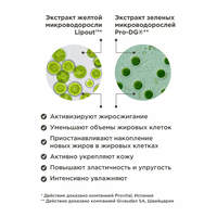 Экстракт зеленых микроводорослей Pro-DG®** — оказывает двойное действие: стимулирует процесс жиросжигания и предотвращает накопление новых липидов в жировых клетках, а также уменьшает объемы жировых клеток, способствуя уменьшению объемов тела.