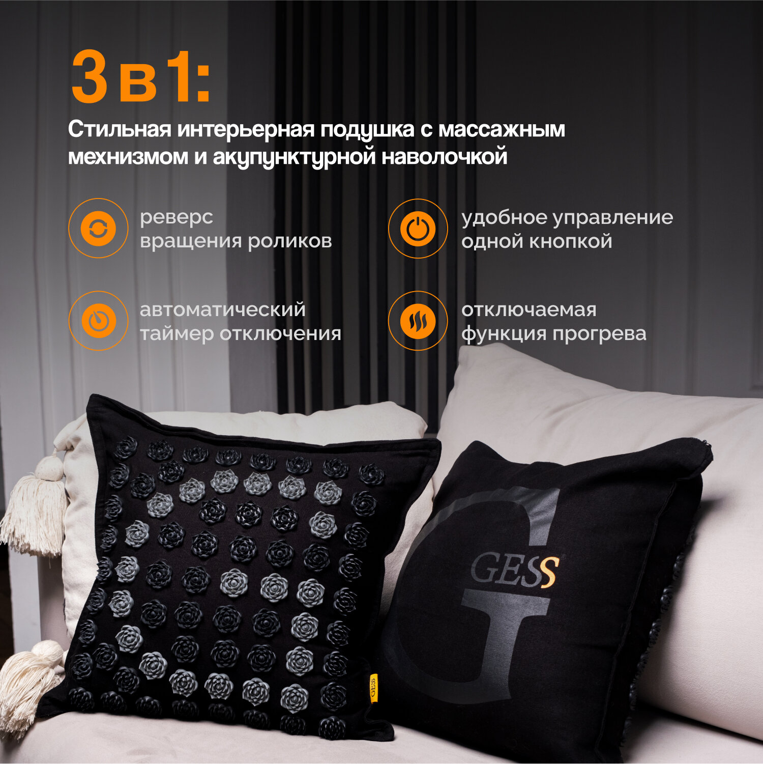 Купить Акупунктурная массажная подушка роликовая GESS Decora, декоративная форма, подогрев, съемный акупунктурный чехол с доставкой по всей России.