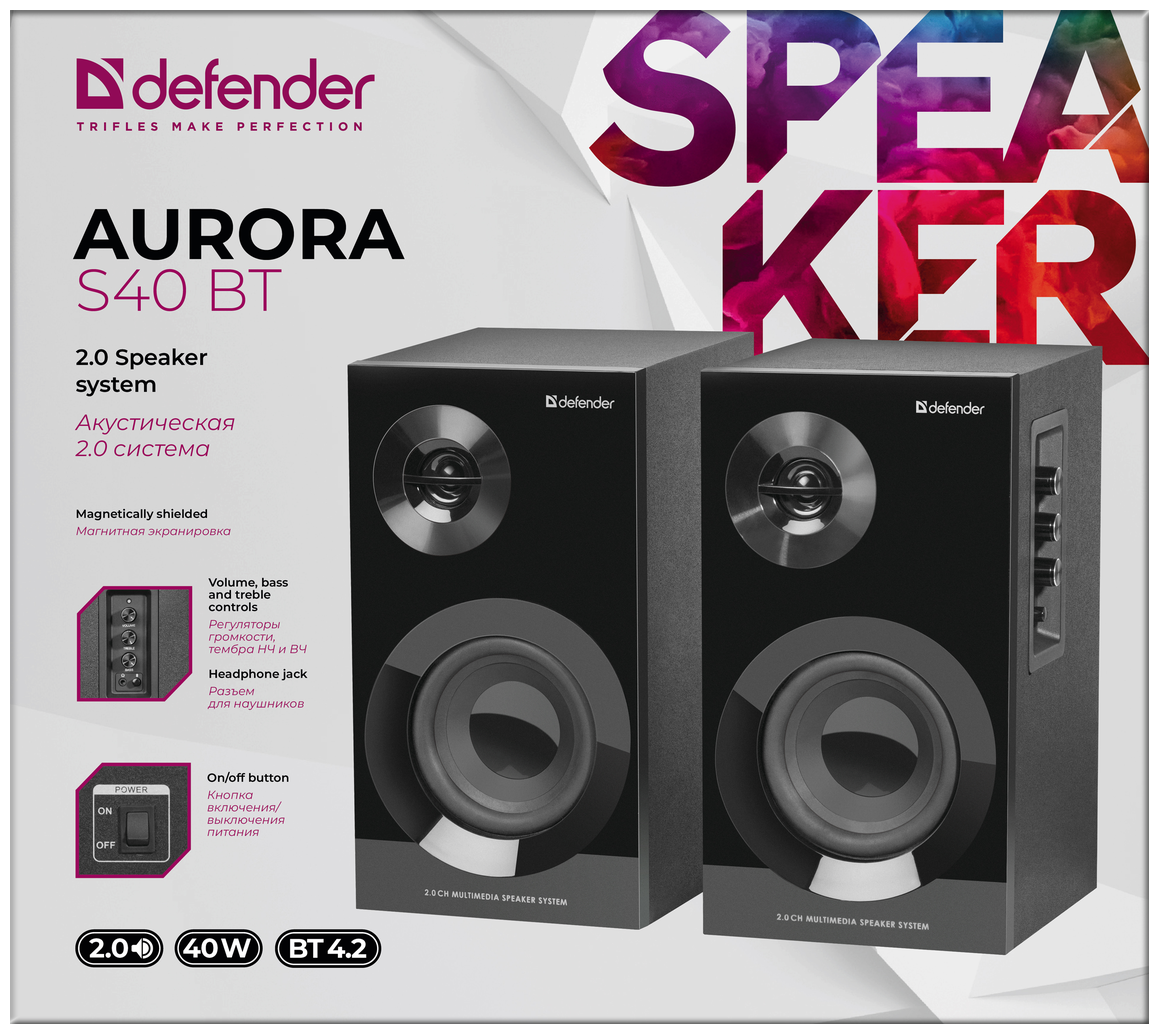 Акустическая система 2.0 DEFENDER Aurora S40 BT (черный+белый,40Вт, bluetooth, 230В) (65240): сравнение цен, характеристики, фото, актуальное наличие и цены.
