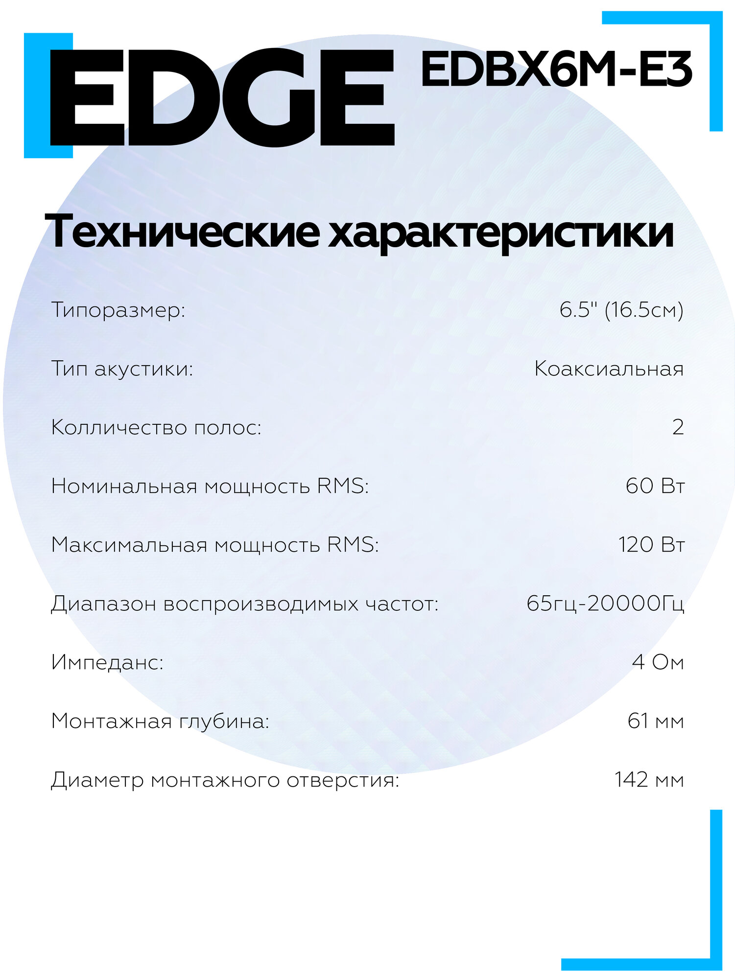Купить Акустическая система EDGE EDBX6M-E3 (2шт) 16.5см / Коаксиальные колонки с доставкой по всей России. Акустическая система EDGE EDBX6M-E3 (2шт) 16.5см / Коаксиальные колонки: сравнение цен, характеристики, фото, актуальное наличие и цены.