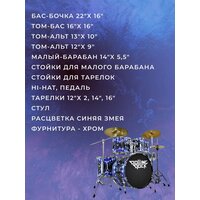 Ударная установка состоит из 5-ти барабанов, цвет синяя змея. Корпус барабанов выполнен из твердых пород дерева, его многослойная структура способствует отличной передаче колебаний, обеспечивая превосходную динамику и мощное объемное звучание.