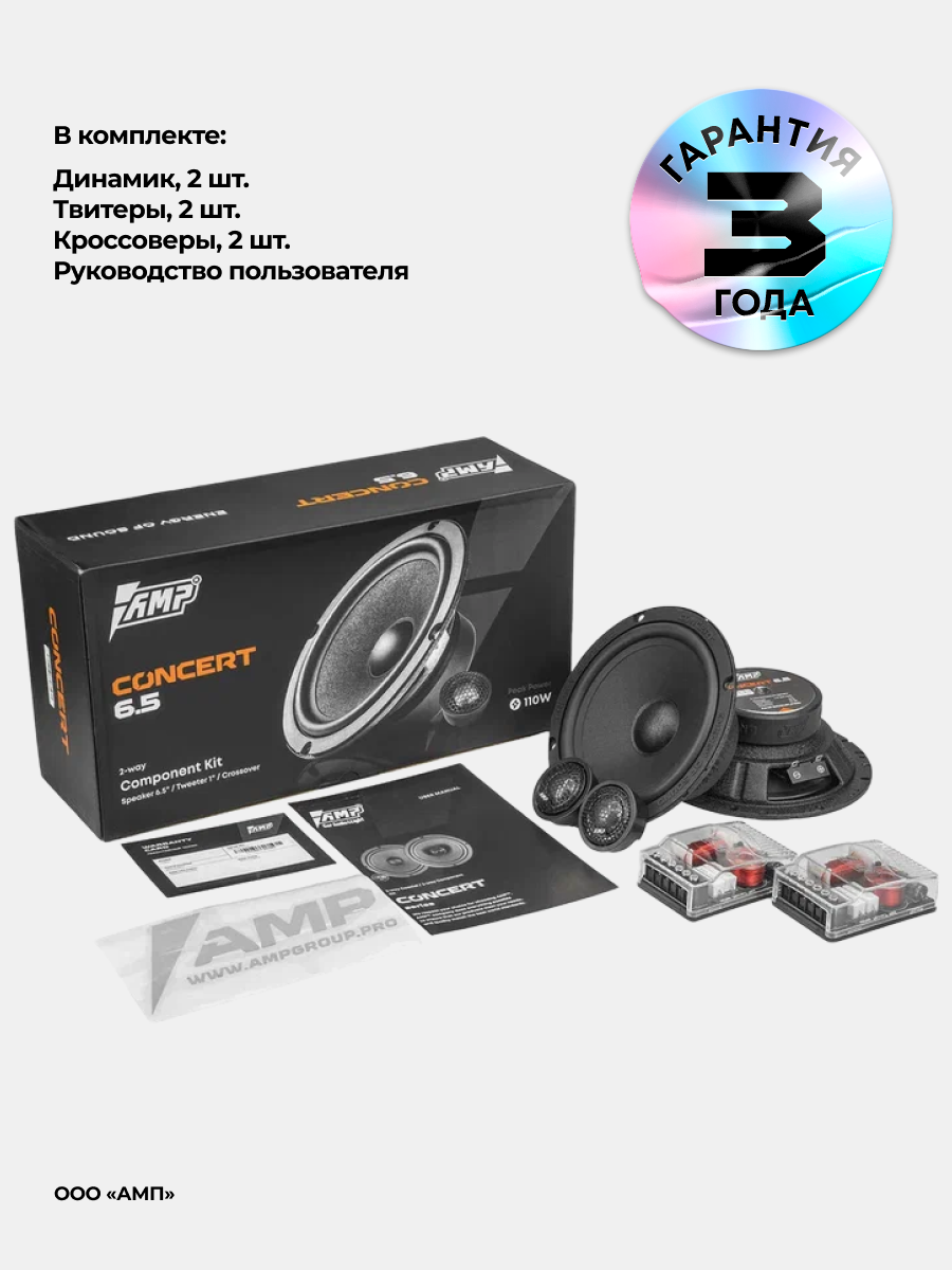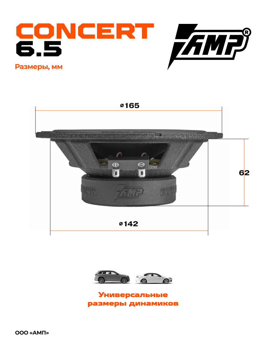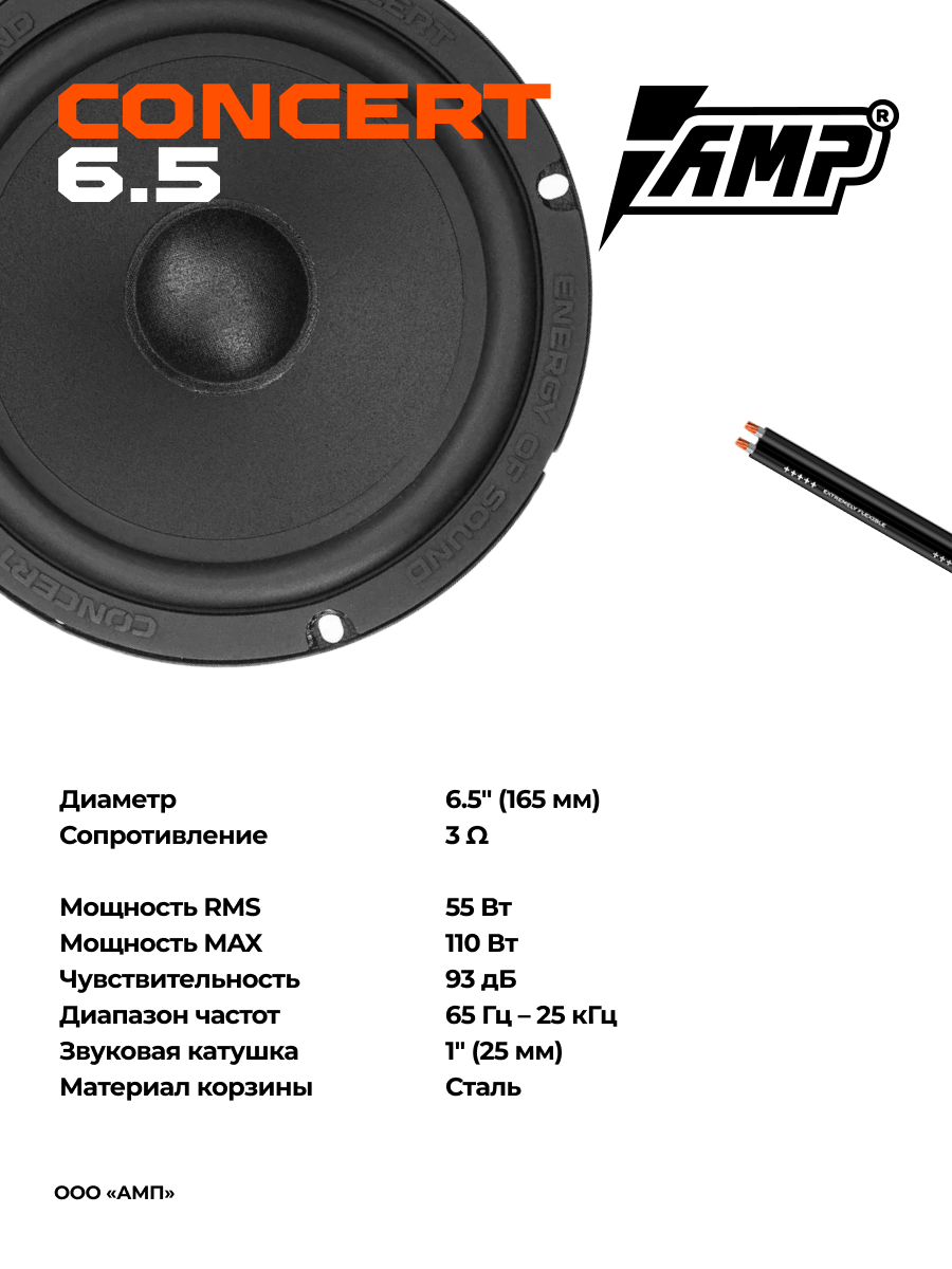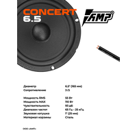 AMP Concert 6.5 - новая серия акустики, разработанная для тех, кто ценит чистоту и легкость в звуке. Серия AMP CONCERT уверенно занимает свои позиции между линейками BEAT и PRO. Мы использовали наш обширный опыт и учли самые важные пожелания наших клиентов. В результате этого подхода появились первые в нашей линейке динамики с применением адаптированной технологии "Polyglass". Диффузор мидбаса изготовлен из прессованной бумаги с особым покрытием, что увеличивает жесткость без значительного увеличения массы. Это позволяет диффузору быть одновременно жестким и легким. Кроме того, такая технология помогает эффективно гасить вибрации внутри диффузора, что улучшает характеристики искажений и нелинейности. Твитер, выполненный из высококачественного шелка, гарантирует чистоту верхних частот. Таким образом, мы предлагаем универсальное решение под любой жанр музыки. С номинальной мощностью 55 Вт и сопротивлением 3 Ом вы сможете наслаждаться громким и насыщенным звуком, подключая акустику даже к головным устройствам или маломощным усилителям. Широкий частотный диапазон от 65 Гц до 25 кГц обеспечивает как глубокие басы, так и чистые высокие ноты. Чувствительность 93 дБ позволяет системе воспроизводить звук с высокой четкостью и точностью. В нашей акустике используется стандартная для данного класса катушка размером 1 дюйм, которая, как показала практика, хорошо справляется с задачами и не утяжеляет подвижную часть. Кроссовер, выполненный по технологии проверенной временем, увеличивает общую эффективность системы, снижая нагрузки и искажения. Мы уделили особое внимание легкости и универсальности серии CONCERT в отношении музыкальных направлений. Уверены, что эти комплекты завоюют признание среди ценителей качественной музыки и бренда AMP. Тип акустики: Компонентная Серия: CONCERT Размер, дюйм (см): 6.5" (16.5) Сопротивление, Ом: 3 Номинальная мощность(RMS), Вт: 55 Чувствительность, дБ: 93 Диапазон частот, Гц: 65 - 25000 Магнит: 80х12 мм Звуковая катушка: 1"(25 мм) ASV Материал диффузора: Прессованная бумага Материал корзины: Сталь Твитер купол: 1"(25 мм) Шёлк