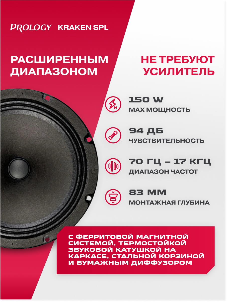 Акустика широкополосная Prology KRAKEN SPL 200 представляет собой высококачественную автомобильную колонку, которая обеспечивает мощное и чистое звучание. Акустика Prology KRAKEN SPL 200 имеет номинальную мощность 90 Вт и максимальную мощность 150 Вт. Это позволяет ей справляться с любыми музыкальными композициями и обеспечивать отличное качество звука. Акустика обладает чувствительностью 94 дБ, что гарантирует хорошую громкость и четкость звука даже на высоких уровнях громкости. Акустика широкополосная Prology KRAKEN SPL 200 имеет типоразмер 20 см (8 дюймов), что делает ее подходящей для большинства автомобилей. Акустика широкополосная Prology KRAKEN SPL 200 оснащена комплектом крепежных элементов, что позволяет легко установить ее в вашем автомобиле. В комплект также входит руководство пользователя, которое поможет вам быстро и легко настроить акустику. Акустика широкополосная Prology KRAKEN SPL 200 выполнена в стильном черном цвете, что позволяет ей гармонично вписаться в интерьер любого автомобиля. В целом, акустика широкополосная Prology KRAKEN SPL 200 является отличным выбором для тех, кто ищет качественное и мощное звучание в своем автомобиле.