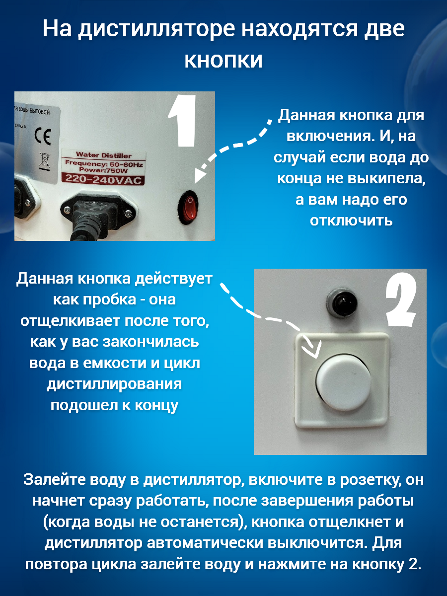 Заливаете воду в дистиллятор, включаете его в розетку, он начнет сразу работать, после завершения работы (когда воды не останется), кнопка отщелкнет и дистиллятор автоматически выключится. Далее если вам нужно цикл повторить, заливаете воду и нажимаете на белую кнопку