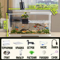Аквариум для черепах и рыб с встроенным фильтром, освещением и островом, белый,55X30X29.4CM: сравнение цен, характеристики, фото, актуальное наличие и цены.
