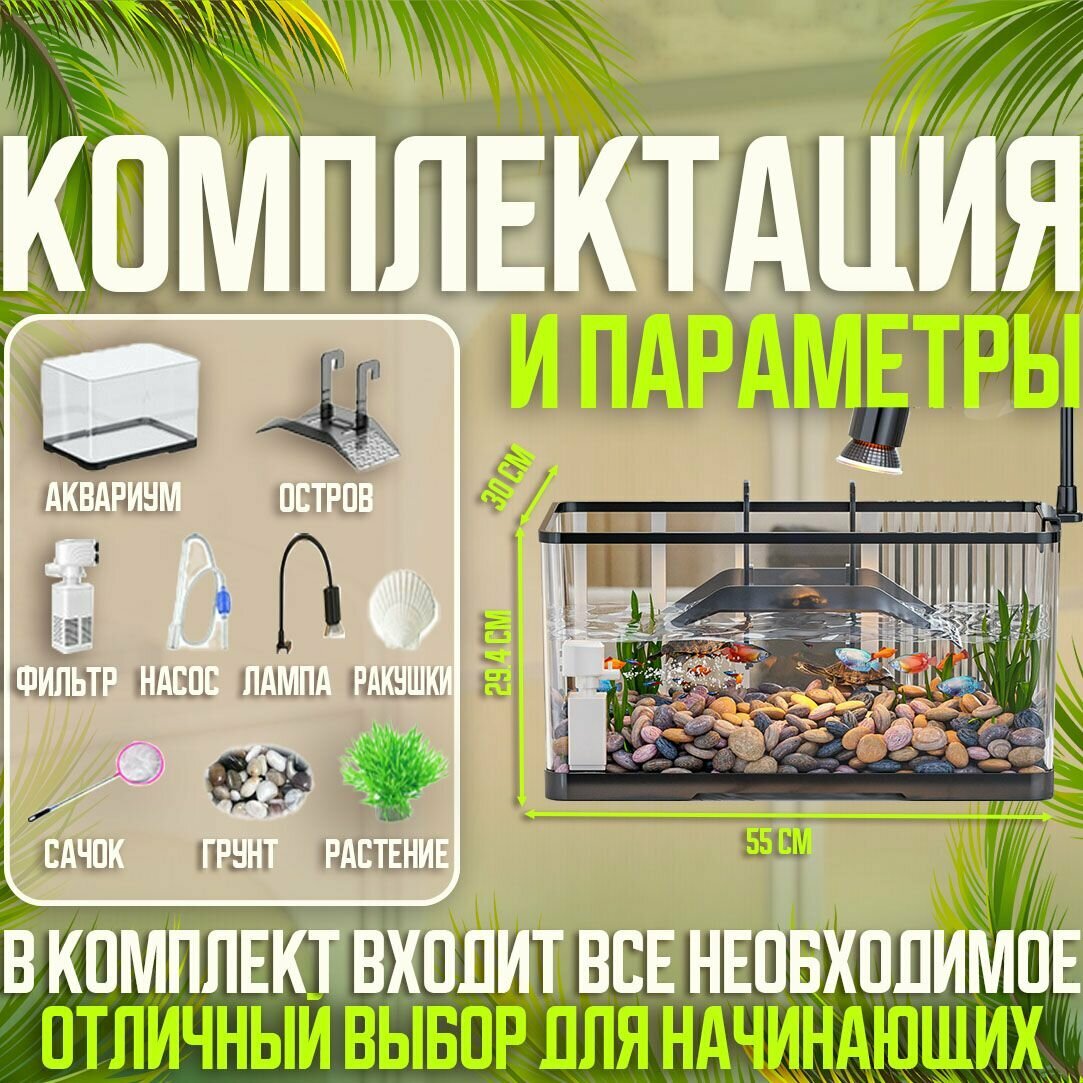 Аквариум для рыб и черепах с встраиваемой лампой, фильтром и островом,55x30x29.4CM: сравнение цен, характеристики, фото, актуальное наличие и цены.