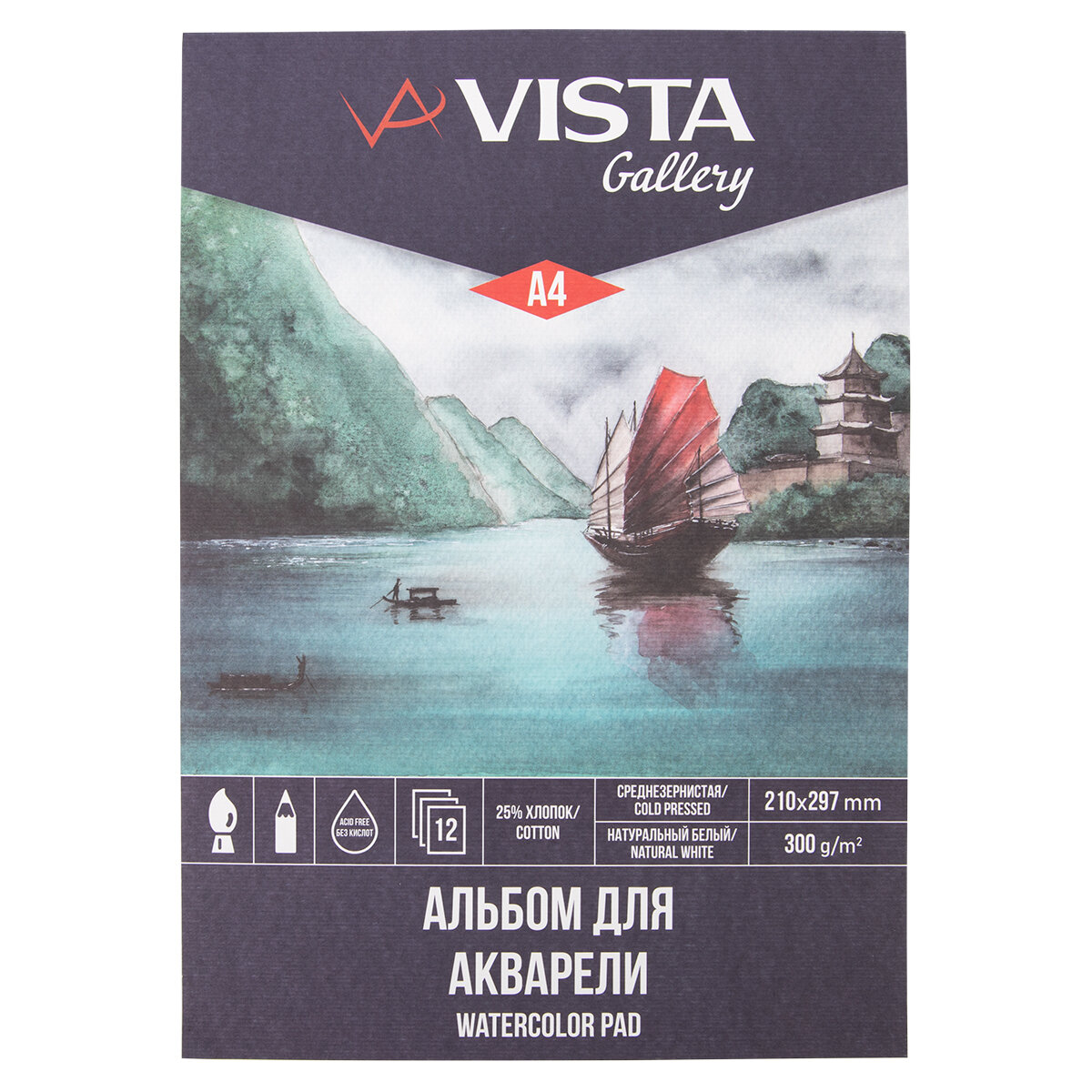 Бумага для акварели «Vista Artista» серии «Gallery» состоит из целлюлозы с 25% хлопка. Высокая плотность 300 г/м2 выдерживает больше воды и позволяет наносить больше краски. Среднезернистая фактура предназначена и для влажных техник, и для детальных прорисовок. Она является достаточно универсальной. Фактура лицевой стороны листа имеет более выраженную структуру, обратная сторона – более гладкая, это позволяет применять разные техники рисования. На ощупь бумага плотная и рыхлая. По внешнему виду классифицируется как фин с равномерной фактурой. Цвет листа – естественный белый. На такой бумаге оттенки будут выглядеть натурально. В ходе тестирования был собран ряд наблюдений: Графит карандаша скользит без усилий, прерываний не видно, линии кажутся стандартными на всех фактурах. Нанесение производилось грифелем повышенной мягкости 9B и обычным – 2B. Оба грифеля удаляются с поверхности, но остаётся в порах и его следы довольно заметны глазу. При стирании грифель заметно «мажет» бумагу. Цветной карандаш также не удаётся стереть «в ноль», но он те так сильно подвержен размазыванию. Чернила: наносились пером «звёздочка», которым удавалось выдавать тонкий штрих. Однако линии получаются рыхлыми и при сильном наполнении пера, и при его опустошении. Скрип сильнее, чем на мелком зерне, перо идёт достаточно жёстко. Из всех образцов эта бумага менее всего подходит для этой техники. При работе мокрым-по-сухому, краска быстро разносится, подчёркивая повторяющиеся текстуру, сильной полосатости не возникает. Краска быстро стабилизируется и не подвержена самораспределению. При смешивании оттенков возникает отчётливый градиент. Эффект грануляции одного из оттенков слабо заметен в полученной смеси. Границы градиента-местами-лёгкие, в зоне конечного нанесения кистью - тяжёлые. После высыхания можно констатировать, что имеет место приглушение тона. При работе мокрым-по-мокрому лучше применить фиксацию. При смачивании бумага приподнимается. При смешении краска прекрасно контролируется и выдаёт плавный градиент. Распадение пигмента одного из цветов красиво подчёркивается фактурой в большей степени, чем при применении меньшего количества воды. Краска быстро выхватывается листом с кисти, но её получается смешать в равномерный градиент. Он получается с плавным затуханием в области контролируемого смешения и тонкими иглами в областях самораспредения. На предварительно смоченную бумагу капается активированная краска и определяется степень растекания Видно, как возникает клякса равномерного цвета, без тяжёлого краяя. Тёмный участок возник только при сильном контакте с кистью в 1 случае. На среднем зерне самораспределение самое равномерное из всех образцов, с достаточно плавным затуханием. Грануляция: пигмент проскальзывает по поверхности, затем схватывается, эффект отчетливее чем на мелком зерне и включение крупнее. После высыхания заливка становится приглушённее, т. к. цвет становится светлее, а пропадающие частицы распределяются довольно равномерно из-за неярковыраженной фактуры бумаги. Маскировочная жидкость наносится легко и быстро схватывается поверхностью бумаги. Снятие производилось при помощи ластика. Застывшая масса подцепляется ластиком без затруднений, легко стирается, образовывая множество ошмётков. Защищаемая область чёткая б