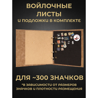 Листы альбома включают 5 войлочных листов формата Optima (200 x 250 мм), каждый с разделительным листом. Вместимость альбома рассчитана на хранение примерно 300 значков (в зависимости от их размеров). Листы обеспечивают надежную фиксацию и удобную систематизацию значков по вашему усмотрению.