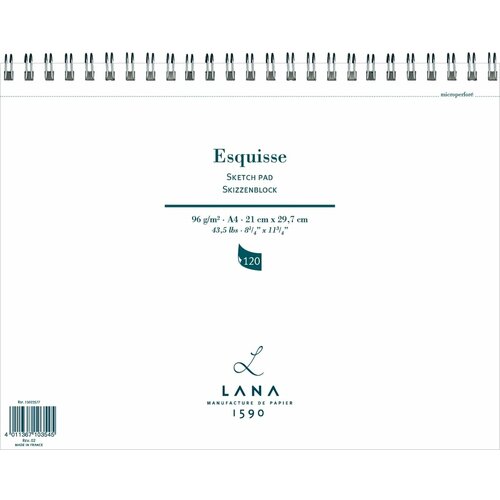15023578 Альбом для эскизов «Esquisse» на спирали. Размер: 29,7х42 см, 120 листов. Плотность: 96 г/м². Матовая бумага с мелким зерном, натуральный белый цвет, без кислот, устойчива к старению. На каждом листе альбома есть микроперфорация для легкого и аккуратного отрывания. Применяется для различных техник: чернографитные карандаши, пастель, фломастер, тушь, уголь, гуашь, мелки. Хранить в сухом месте. Срок годности не ограничен. Производитель: Lana Manufacture de papier, Франция.