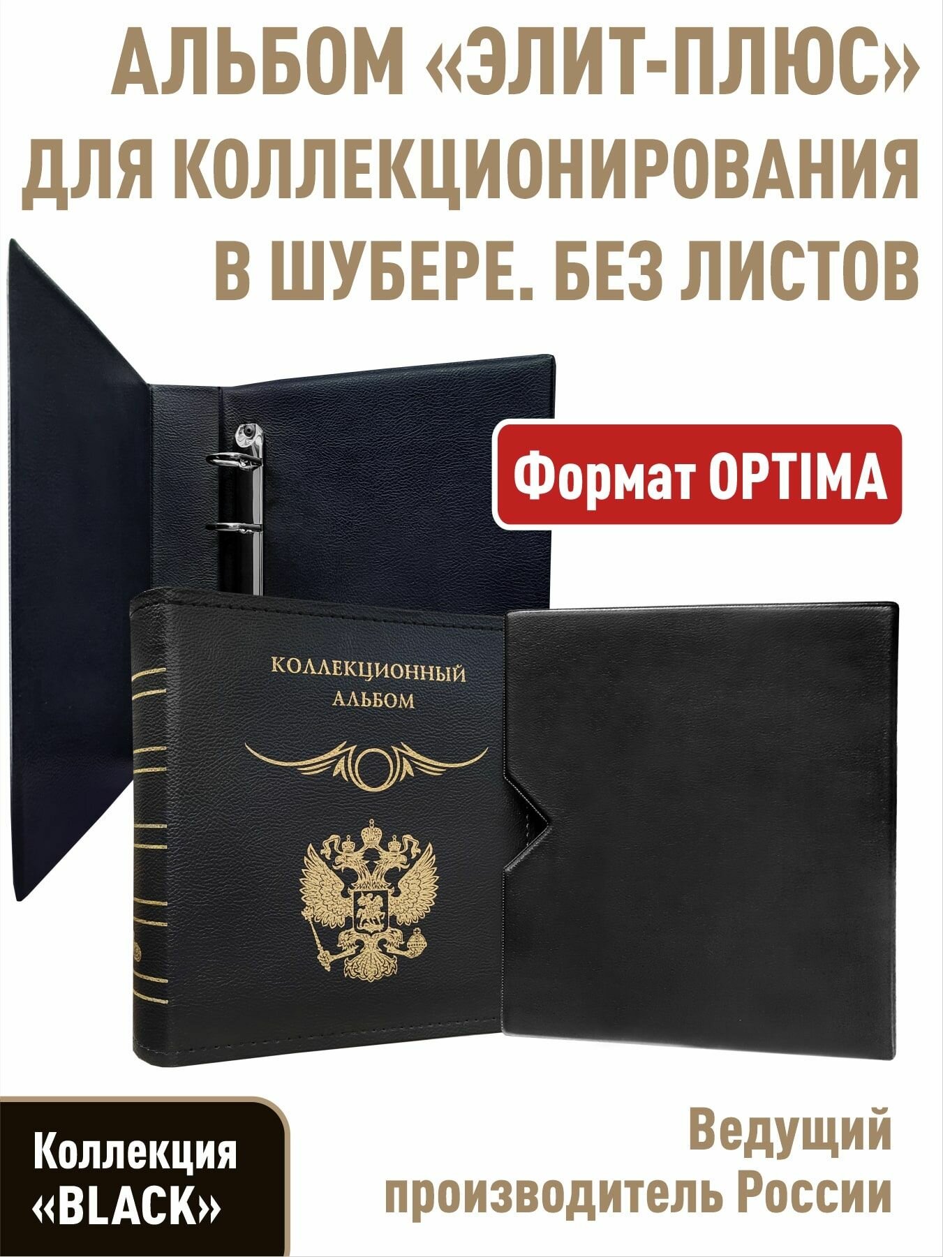 Альбом "элит-плюс" изготовлен из итальянской высококачественной искусственной кожи. Прошит по периметру. Усилен для возможности хранения тяжелого коллекционного материала (монеты, награды, значки). Альбомы стандарта "OPTIMA" имеют размер около 230х270 мм. Размер листов 200х250 мм с креплением на 4 кольца. В комплект входит шубер, который дает альбому дополнительную жесткость и стабильную форму. Шубер защищает альбом от повреждений, листы от пыли, увеличивая их срок службы. Шубер изготовлен из пленки ПВХ. Цвет: черный. идеально подходит для подарка!