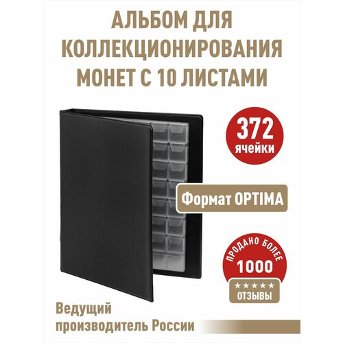 Альбом "Коллекция-Плюс" изготовлен из ПВХ. Альбом имеет размер 240х275 мм с креплением на 4 кольца. В стандартную комплектацию входит 10 листов с «клапанами»: -- 4 листа на 48 ячеек для хранения монет диаметром до 22 мм -- 4 листа на 35 ячеек для монет диаметром до 28 мм -- 2 листа на 20 ячеек для монет диаметром до 40 мм (Данная информация приблизительна и рассчитана при толщине монет до 2,5 мм) Итого: 372 монеты. Размер листов формата "Optima" 200х250 мм. В альбом входит от 15 до 20 листов для хранения монет, в зависимости от толщины коллекционного материала. Листы ALBOMMONET и альбомов Вы можете купить дополнительно.