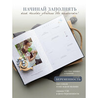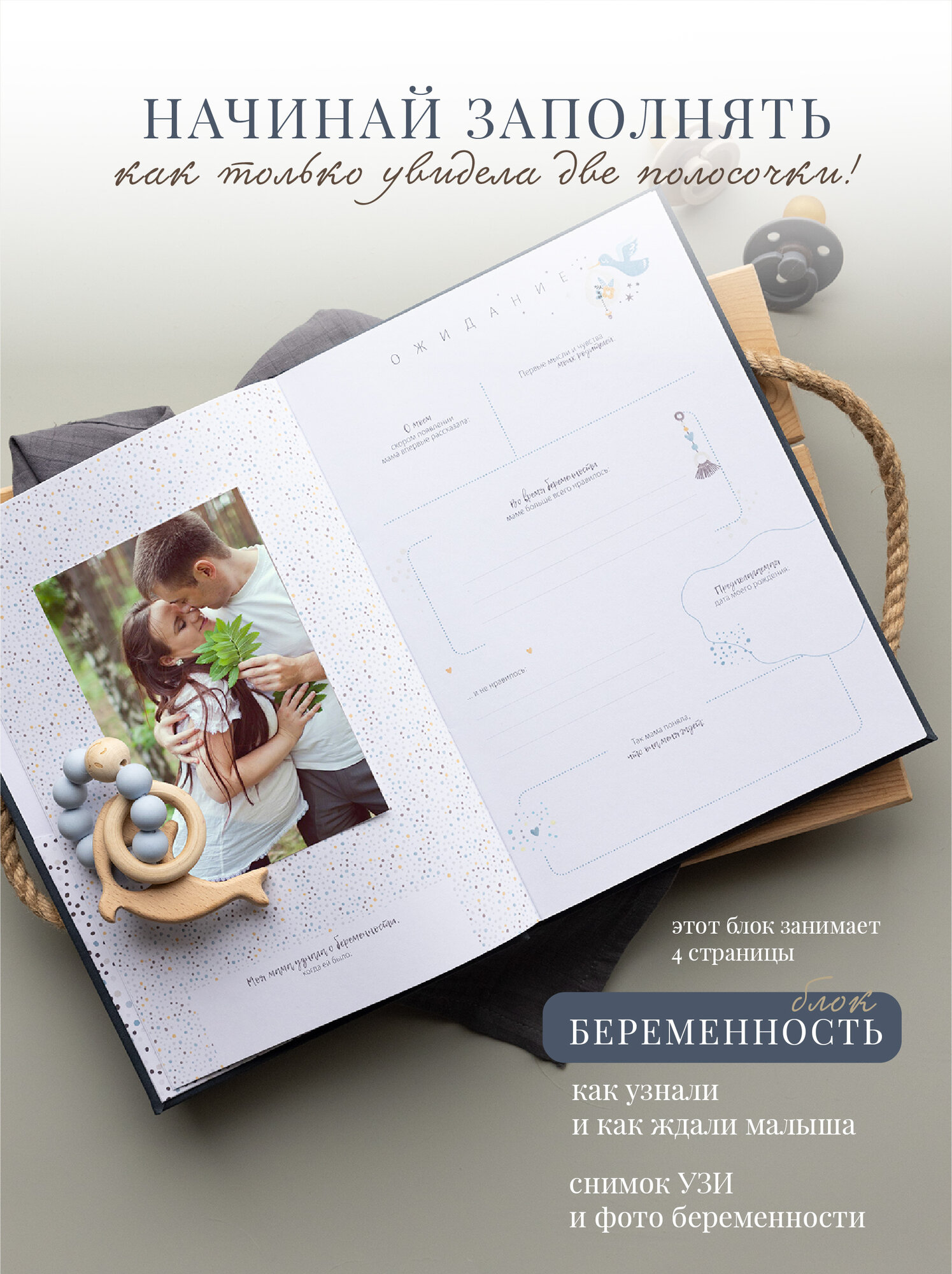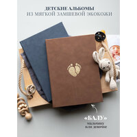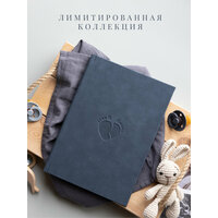 Фотоальбом для детской истории. Альбом с обложкой из тёмно-синей бархатной кожи. Внутри белая бумага, цветная печать. Первый альбом малыша имеет ручной переплет блока страниц для надежности и долговечности. Предназначен от беременности мамы до 6 лет ребенка.