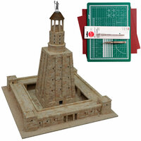 Керамическую модель Александрийского маяка предлагает вам сделать испанская фирма Aedes Ars. Весь маяк собирается из отдельных керамических кирпичиков, как настоящий. Картонные детали основы модели уже готовы и вырезаны по размерам, вам остаётся только согнуть их по разметке. Кроме того, на деталях основы указано, какой тип керамических деталей клеится в каждом конкретном месте, поэтому запутаться невозможно. В наборе вы найдёте керамические кирпичики нескольких видов, а также керамические детали лестниц, уже готовые, так что вам не придётся утомительно выпиливать каждую ступеньку. Для имитации грунта вокруг маяка производитель предлагает раскрошить несколько кирпичиков. Клей в комплекте, опционально.