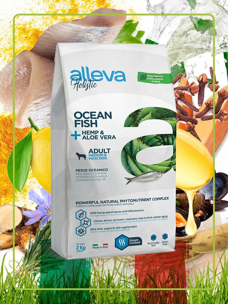 Alleva Holistic Adult Ocean Fish + Hemp & Aloe vera Medium/Maxi 2 Kg/ Полнорационный сухой корм Аллева Холистик с океанической рыбой и алое вера для взрослых собак средних и крупных пород 2 кг.