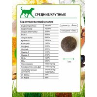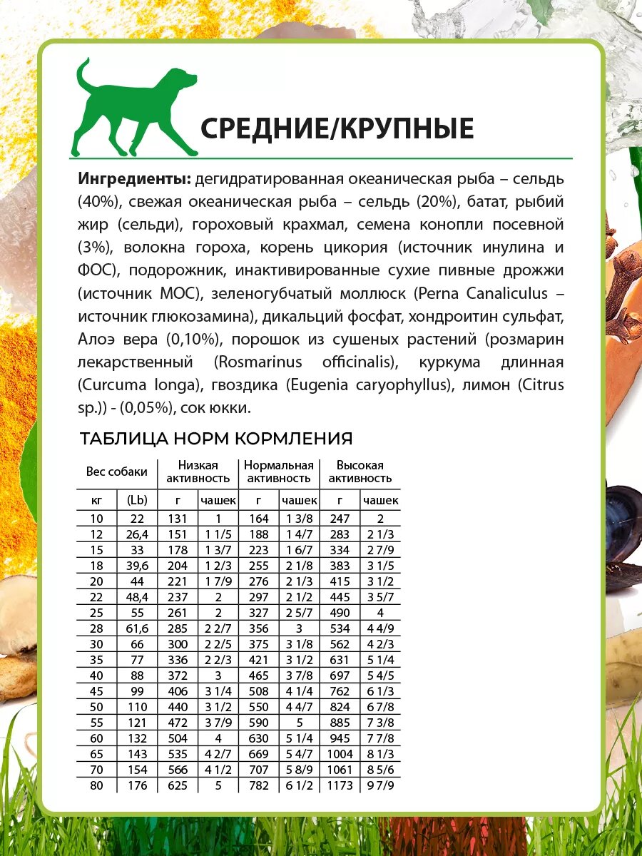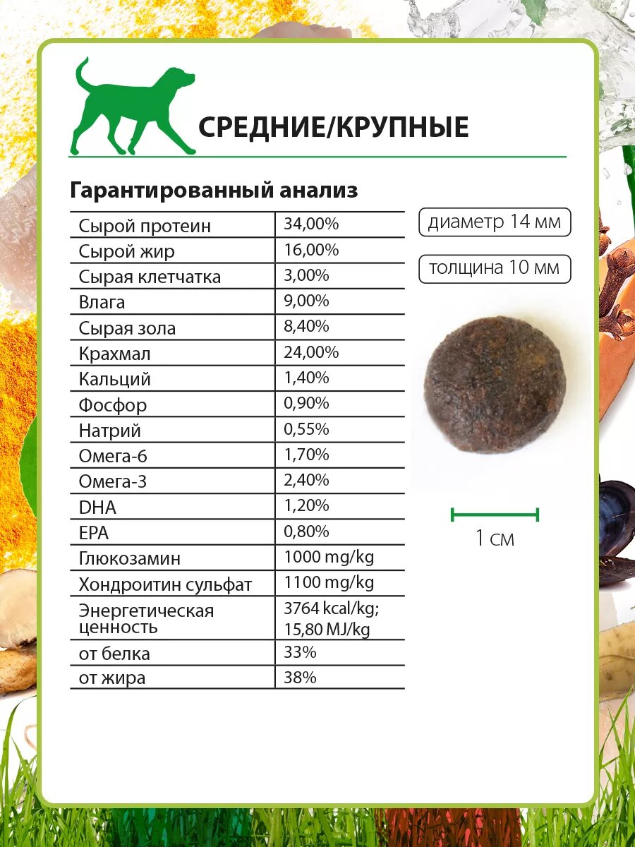 сырой протеин – 34,00%, сырой жир – 16,00%, сырая клетчатка – 3,00%, влага – 9,00%, сырая зола – 8,40%, крахмал – 24,00%, Кальций – 1,40%, Фосфор – 0,90%, Натрий – 0,55%, Омега-6 – 1,70%, Омега-3 – 2,40%, докозагексаеновая кислота (DHA) - 1,20%; эйкозапентаеновая кислота (EPA) - 0,80%; глюкозамин – 1000 мг/кг; хондроитин сульфат – 1100 мг/кг. Энергетическая ценность: 3764 ккал/кг; 15,80 МДж/кг (33% от белка, 38% от жира).