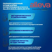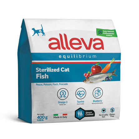 Alleva Equilibrium Cat, Sterilized Fish. Полнорационный сухой корм для взрослых стерилизованных кошек и кастрированных котов с рыбой. В линейке представлены продукты для животных с чувствительным пищеварением и склонностью к аллергиям, специальный корм для котят, а также стерилизованных кошек и кастрированных котов. Продукт приготовлен на пару, чтобы сохранить качество ингредиентов. В состав кормов Alleva Equilibrium добавлены фрукты и овощи (черника, клюква, яблоко и морковь) в качестве дополнительного источника растворимой клетчатки, витаминов и минералов, а также природных антиоксидантов, которые обеспечивают свежесть корма на протяжении всего срока годности. В составе кормов Alleva Equilibrium содержится как свежее, так и дегидратированное мясо, что гарантирует превосходный вкус и высокое качество белков животного происхождения. Благодаря широкому ассортименту различных вкусов (кролик, курица, утка, оленина и рыба) для любой даже самой привередливой кошки возможно подобрать оптимальный рацион и разнообразить питание. Источники жиров проходят строгий контроль: рыбий и куриный жир сохраняются при помощи использования природных антиоксидантов, проходят проверку, а также полный анализ незаменимых жирных кислот, чтобы гарантировать оптимальный баланс Омега-6 и Омега-3. Также формула кормов обогащена таурином и L-карнитином для поддержания работы основных систем организма.