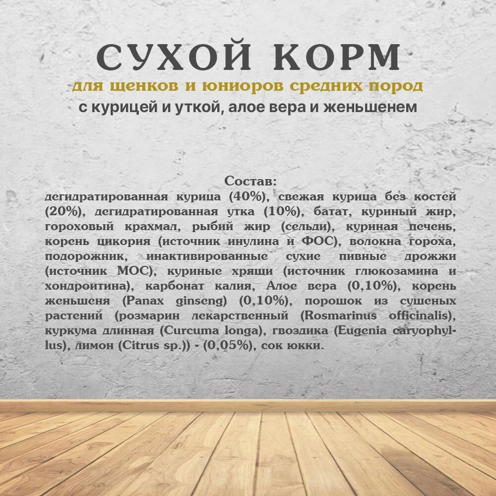 Ингредиенты дегидратированная курица (40%), свежая курица без костей (20%), дегидратированная утка (10%), батат, куриный жир, гороховый крахмал, рыбий жир, куриная печень, корень цикория (источник инулина и ФОС), волокна гороха, подорожник, инактивированные сухие пивные дрожжи (источник МОС), куриные хрящи (источник глюкозамина и хондроитина), карбонат калия, Алое вера (0,10%), корень женьшеня (Panax ginseng) (0,10%), розмарин лекарственный, куркума длинная, гвоздика, лимон (Rosmarinus officinalis, Curcuma longa, Eugenia caryophyllus, Citrus sp.) - (0,05%), сок юкки. Добавки на 1 кг Витамин А (3a672a) ; 24000 МЕ; Витамин D3 (3a671) ; 1320 МЕ; Витамин Е (3а700) ; 720 мг; Витамин B1 (3a820) ; 9,60 мг; Витамин B2 ; 60 мг; Витамин B6 (3a831) ; 60 мг; Витамин B12 ; 0,12 мг; Ниацинамид (3а315) - 168 мг; Биотин (3a880) - 9,60 мг; Фолиевая кислота (3a316) - 2,40 мг; D-пантотенат кальция (3a841) - 60 мг; Витамин С (3a300) - 180 мг; Бета-каротин (3a160(a)) - 60 мг; Холина хлорид (3a890) - 2500 мг; Цинк (3b6.10) (Хелат цинка с метионин гидрокси-аналогом) - 120 мг; Марганец (3b5.10) (Хелат марганца с метионин гидрокси-аналогом) - 30 мг; Железо (3b106) (Железа (II) хелат аминокислоты гидрат) - 120 мг; Медь (3b4.10) (Хелат меди с метионин гидрокси-аналогом) - 12 мг; Селен (3b8.12) (селенометионин из пекарских дрожжей CNCM I-3399 (деактивированные селеновые дрожжи)) - 0,50 мг; DL-метионин (3c301) - 3000 мг; Таурин 3a370) - 1000 мг; L-карнитин (3a910) - 500 мг. Специальные добавки: экстракт розмарина, экстракт зеленого чая. Антиоксиданты: экстракт токоферолов натурального происхождения. Гарантированный анализ сырой протеин ; 37,00%, сырой жир ; 20,00%, сырая клетчатка ; 1,40%, влага ; 9,00%, сырая зола ; 8,30%, крахмал ; 21,00%, Кальций ; 1,60%, Фосфор ; 1,20%, Натрий ; 0,45%, Омега-6 ; 2,40%, Омега-3 ; 1,20%, докозагексаеновая кислота (DHA) - 0,40%; эйкозапентаеновая кислота (EPA) - 0,60%; глюкозамин ; 1300 мг/кг; хондроитин сульфат ; 1100 мг/кг. Энергетическая ценность 4068 ккал/кг; 17,1 МДж/кг (33,5% от белка, 45% от жира).