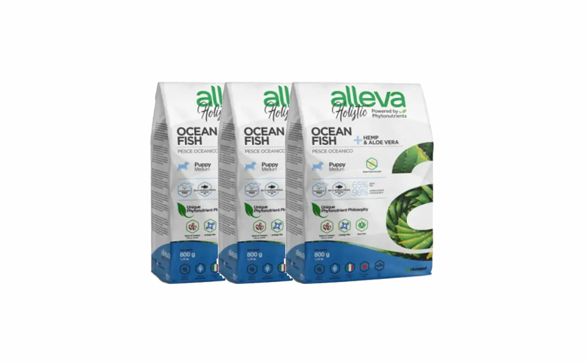 Alleva Holistic Puppy/Junior Ocean Fish Medium сухой корм для щенков средних пород с океанической рыбой, коноплей и алое вера 800 г х 3 шт.