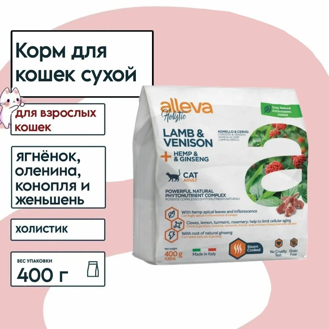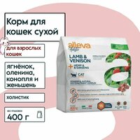 Alleva Holistic Ягненок, Оленина, Конопля и Женьшень Полнорационный сухой корм для взрослых кошек. Ингредиенты дегидратированная ягнятина (42%), свежая ягнятина (20%), дегидратированная оленина (12%), батат, куриный жир, гороховый крахмал, рыбий жир, волокна гороха, куриная печень, корень цикория (источник инулина и ФОС), подорожник, инактивированные сухие пивные дрожжи (источник МОС), карбонат калия, глюкозамин, хондроитин сульфат, конопля посевная (верхние листья – 0,10%, соцветия – 0,005%), корень женьшеня (Panax ginseng) (0,10%), розмарин лекарственный, куркума длинная, гвоздика, лимон (Rosmarinus officinalis, Curcuma longa, Eugenia caryophyllus, Citrus sp.) - (0,05%), сок юкки. Добавки на 1 кг Витамин А (3a672a) – 24000 МЕ; Витамин D3 (3a671) – 1320 МЕ; Витамин Е (3а700) – 720 мг; Витамин B1 (3a820) – 9,60 мг; Витамин B2 – 60 мг; Витамин B6 (3a831) – 60 мг; Витамин B12 – 0,12 мг; Ниацинамид (3а315) - 168 мг; Биотин (3a880) - 9,60 мг; Фолиевая кислота (3a316) - 2,40 мг; D-пантотенат кальция (3a841) - 60 мг; Витамин С (3a300) - 180 мг; Бета-каротин (3a160(a)) - 60 мг; Холина хлорид (3a890) - 2500 мг; Цинк (3b6.10) (Хелат цинка с метионин гидрокси-аналогом) - 120 мг; Марганец (3b5.10) (Хелат марганца с метионин гидрокси-аналогом) - 30 мг; Железо (3b106) (Железа (II) хелат аминокислоты гидрат) - 120 мг; Медь (3b4.10) (Хелат меди с метионин гидрокси-аналогом) - 12 мг; DL-метионин (3c301) - 4000 мг; Таурин (3a370) - 4000 мг; L-карнитин (3a910) - 500 мг. Специальные добавки: экстракт розмарина, экстракт зеленого чая. Антиоксиданты: экстракт токоферолов натурального происхождения. Гарантированный анализ сырой протеин – 40,00%, сырой жир – 18,00%, сырая клетчатка – 2,00%, влага – 7,00%, сырая зола – 8,60%, крахмал – 20,00%, Кальций – 1,65%, Фосфор – 1,20%, Натрий – 0,60%, Магний - 0,09%; Омега-6 – 2,30%, Омега-3 – 1,30%, докозагексаеновая кислота (DHA) - 0,40%; эйкозапентаеновая кислота (EPA) - 0,60%; глюкозамин – 1300 мг/кг; хондроитин сульфат – 1100 мг/кг. Энергетическая ценность 4020 ккал/кг; 16,9 МДж/кг (37% от белка, 40% от жира).