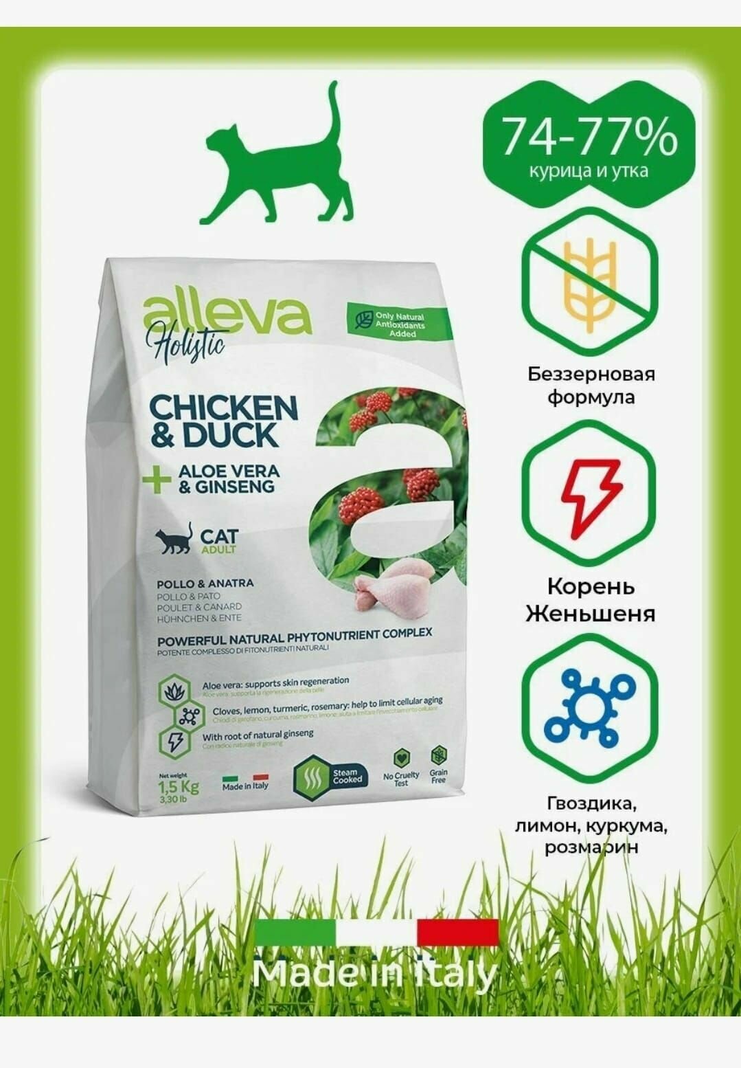 | Дозировка | Нормы кормления указаны в таблице на упаковке. При переводе на корм Alleva Holistic рекомендуется постепенно в течение 1-2 недель замещать предыдущий корм на новый. |