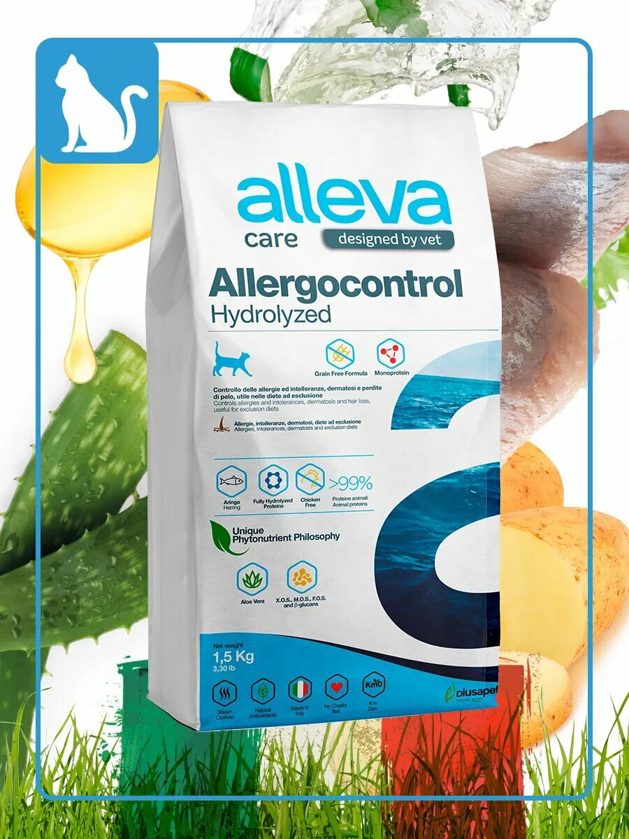 Alleva Care Cat Allergocontrol / Полнорационный сухой диетический корм Аллева Аллергоконтроль для кошек всех возрастов. Благодаря соответствующему сочетанию основных питательных свойств, корм предназначен для снижения пищевой непереносимости к определенным ингредиентам или питательным веществам. Рекомендуется также в качестве поддержки функции кожи и ее производных в случае дерматоза и чрезмерного выпадения шерсти. Для ограничения реакций иммунной системы в корме Alleva Care Allergocontrol в качестве единственного источника белка используется гидролизованная сельдь с низким молекулярным весом (70% ниже 2 000 дальтон, максимально 6 000 дальтон), а в качестве углеводов используется картофельный крахмал, прошедший тщательную очистку от белковой составляющей. Высокая концентрация незаменимых жирных кислот (линолевая кислота, эйкозапентаеновая кислота (EPA) и докозагексаеновая кислота (DHA)) из жира сельди и масла подсолнечника поддерживает здоровье кожи и уменьшает воспаление. Очищенный Алоэ вера способствует укреплению общей резистентности организма, стимулирует процессы регенерации кожи и эпителиальный трофизм. Alleva — полнорационные корма для кошек и собак, гарантия правильного и здорового питания для каждого питомца, строгий контроль качества на каждом этапе производства, лучшее отборное сырье и натуральные фитонутриенты. Гарантированный анализ: сырой протеин – 30,00%, сырой жир –16,00%, сырая клетчатка – 1,50%, влага – 7,00%, сырая зола – 7,50%, Кальций – 1,30%, Фосфор – 0,90%, Натрий – 0,40%, Калий – 0,60%, Магний - 0,06%; Омега-6 – 1,45%, Омега-3 – 2,70%, докозагексаеновая кислота (DHA) - 1,20%; эйкозапентаеновая кислота (EPA) - 0,90%, EPA+DHA – 2,10%, Линолевая кислота – 1,35%. Энергетическая ценность: 3930 ккал/кг; 16,5 МДж/кг (31% от белка, 38% от жира). Белок животного происхождения: 99%.