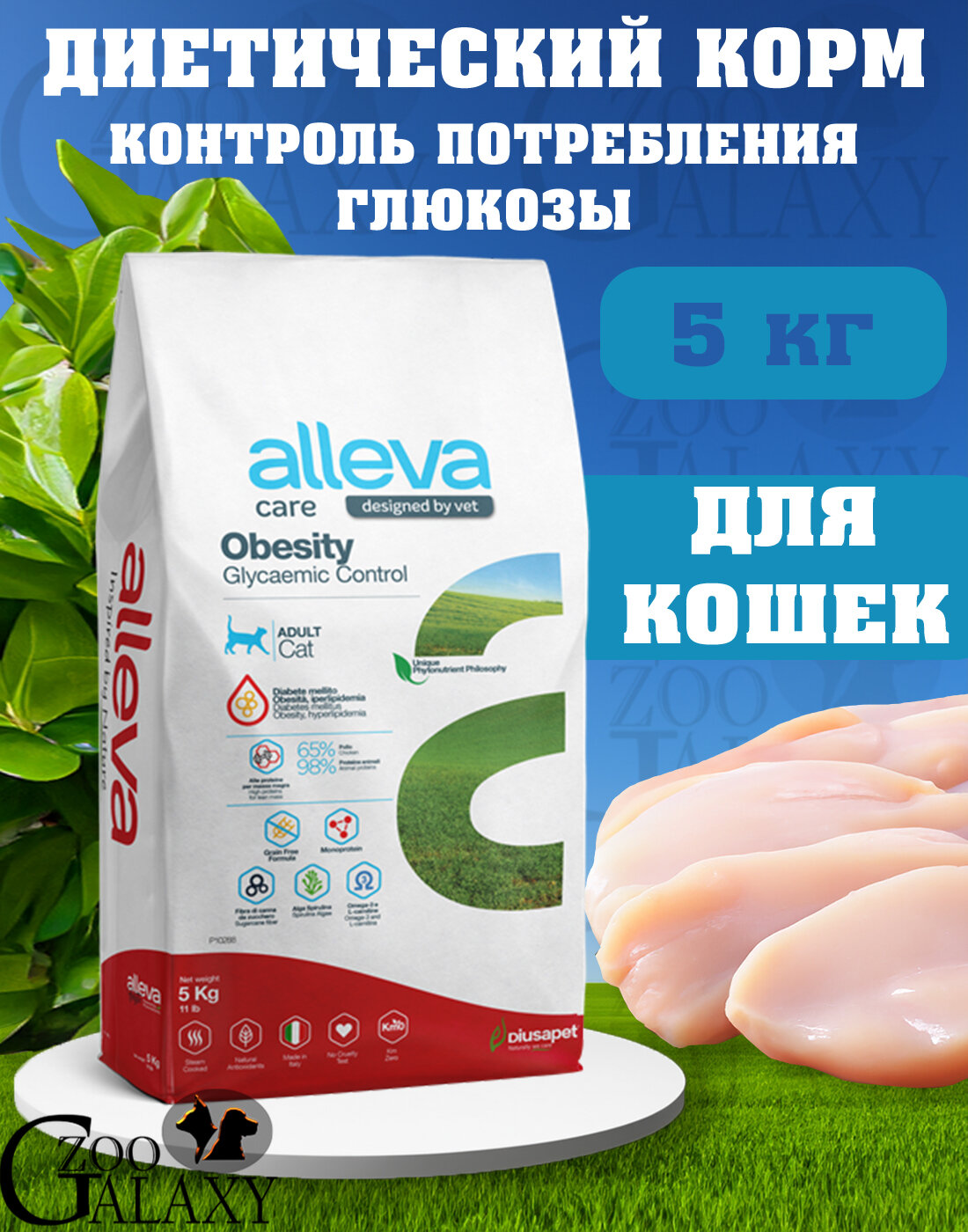 Полнорационный сухой диетический корм для взрослых кошек, предназначенный для снижения избыточной массы тела, а также контроля потребления глюкозы (сахарного диабета). Корм также показан для поддержки липидного обмена в случае гиперлипидемии. Корм Alleva Care Obesity Glycaemic Control имеет низкий уровень жиров и более низкую энергетическую плотность для снижения массы тела животного.